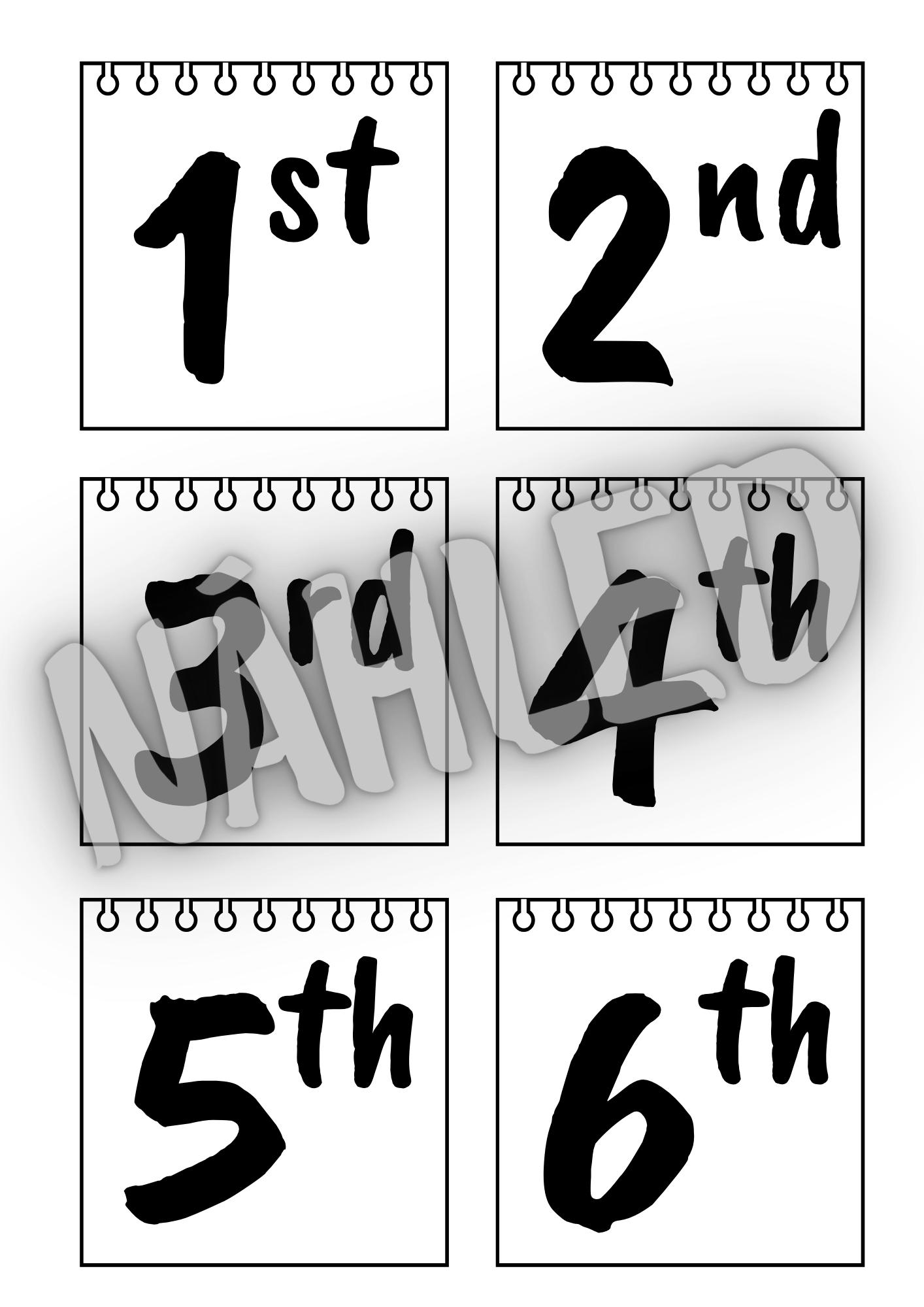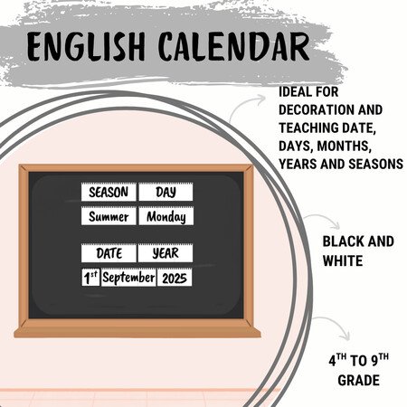Anglický kalendář ideální pro výuku dat, dnů, měsíců, roků a ročních období. Vhodné i jako univerzální černobílá výzdoba třídy pro vyšší ročníky, nejen pro žáky 1. stupně.