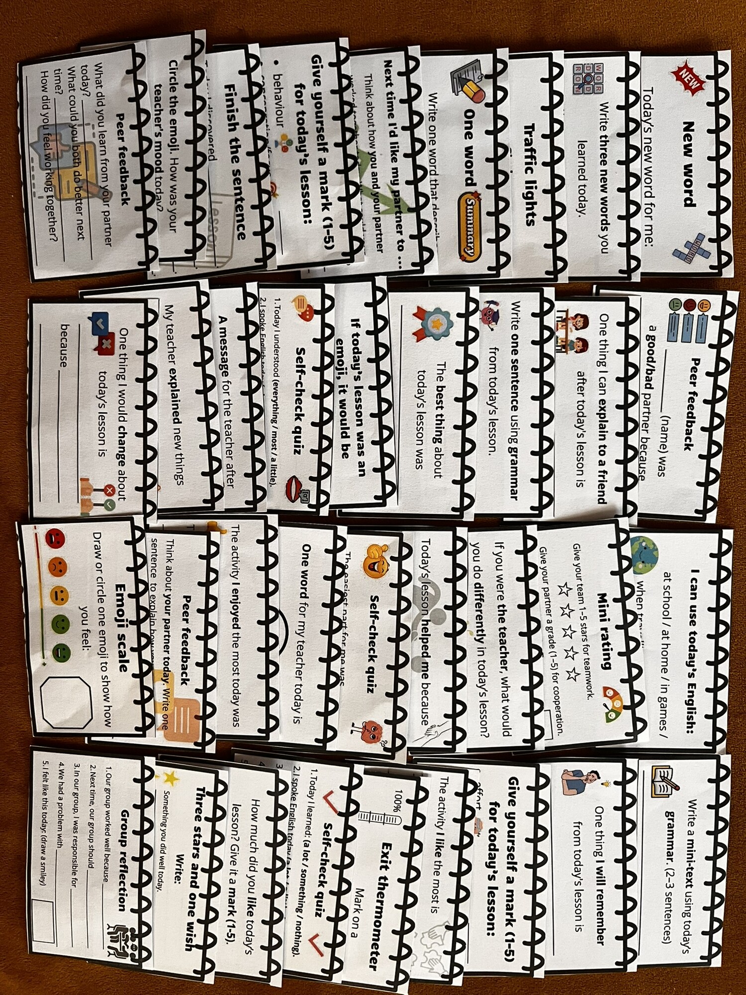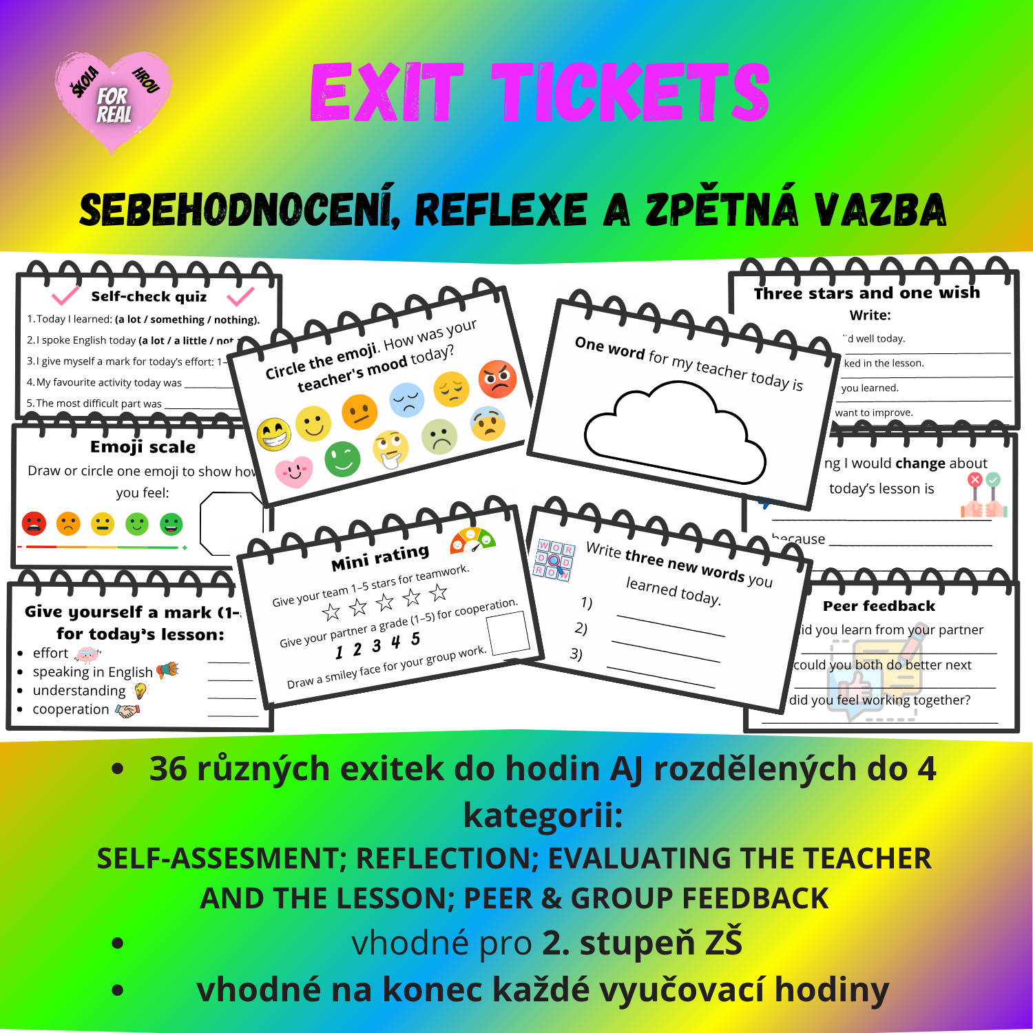 Tento materiál nabízí sbírku 36 různých exitek (exit tickets) do hodin angličtiny převážně na 2. stupni základní školy.