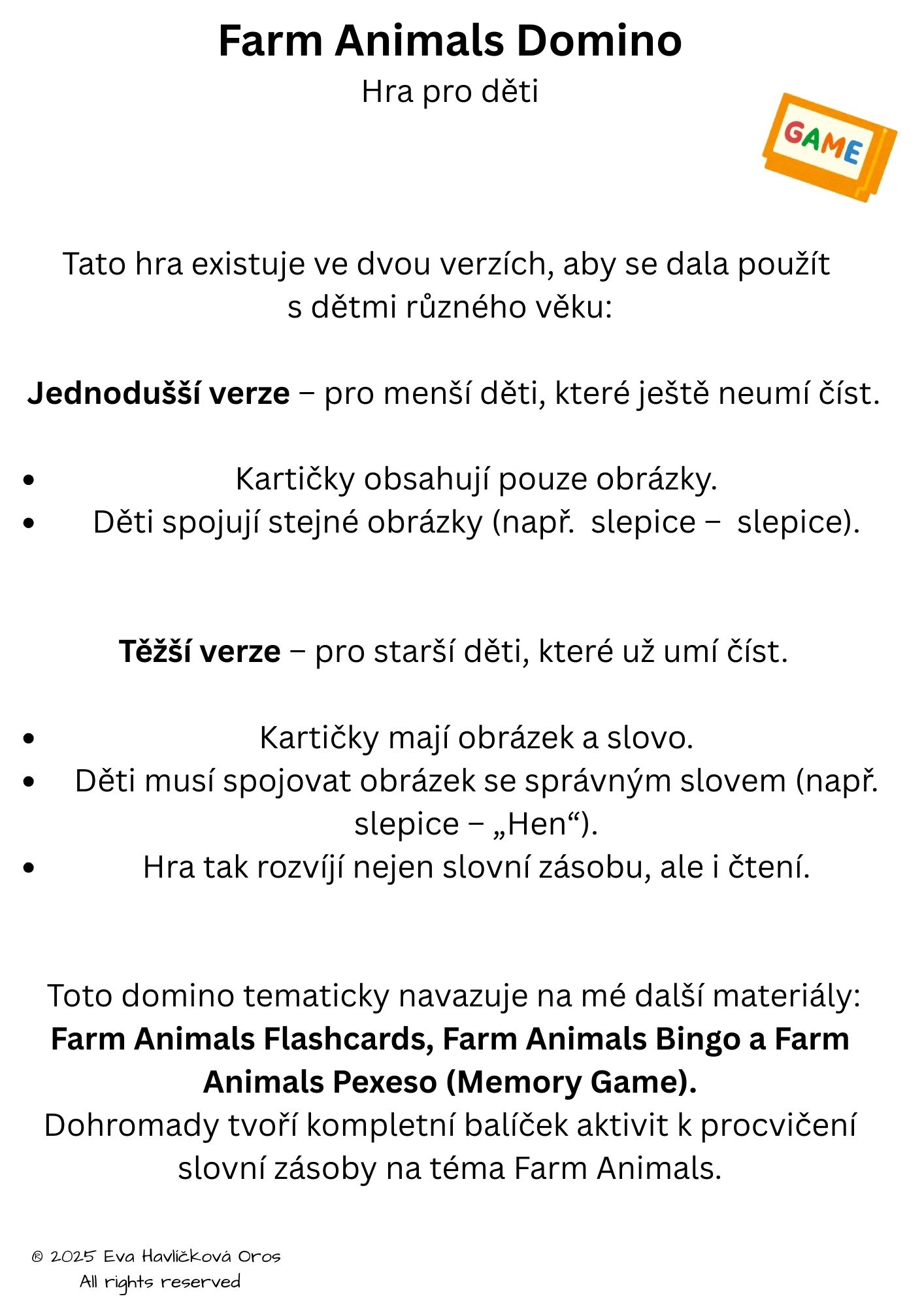 Dohromady tvoří kompletní balíček aktivit k procvičení slovní zásoby na téma Farm Animals.