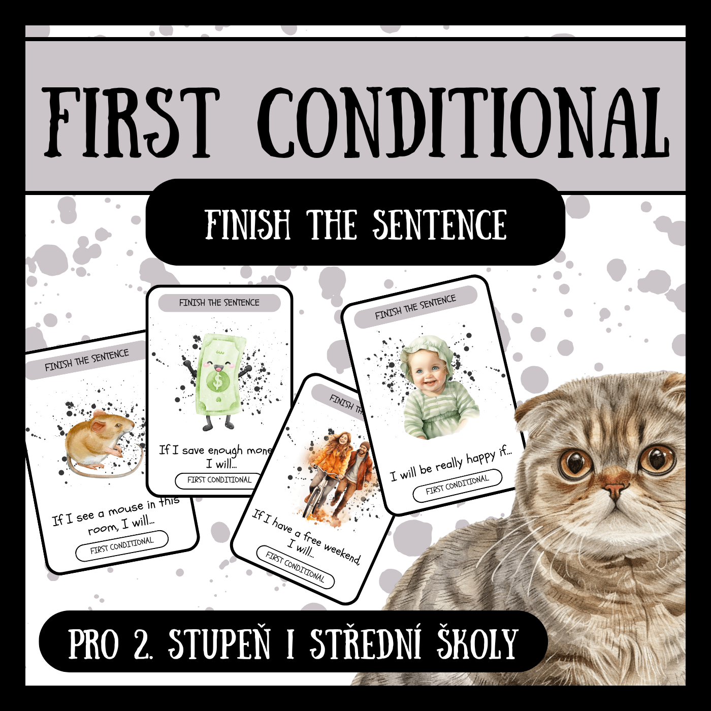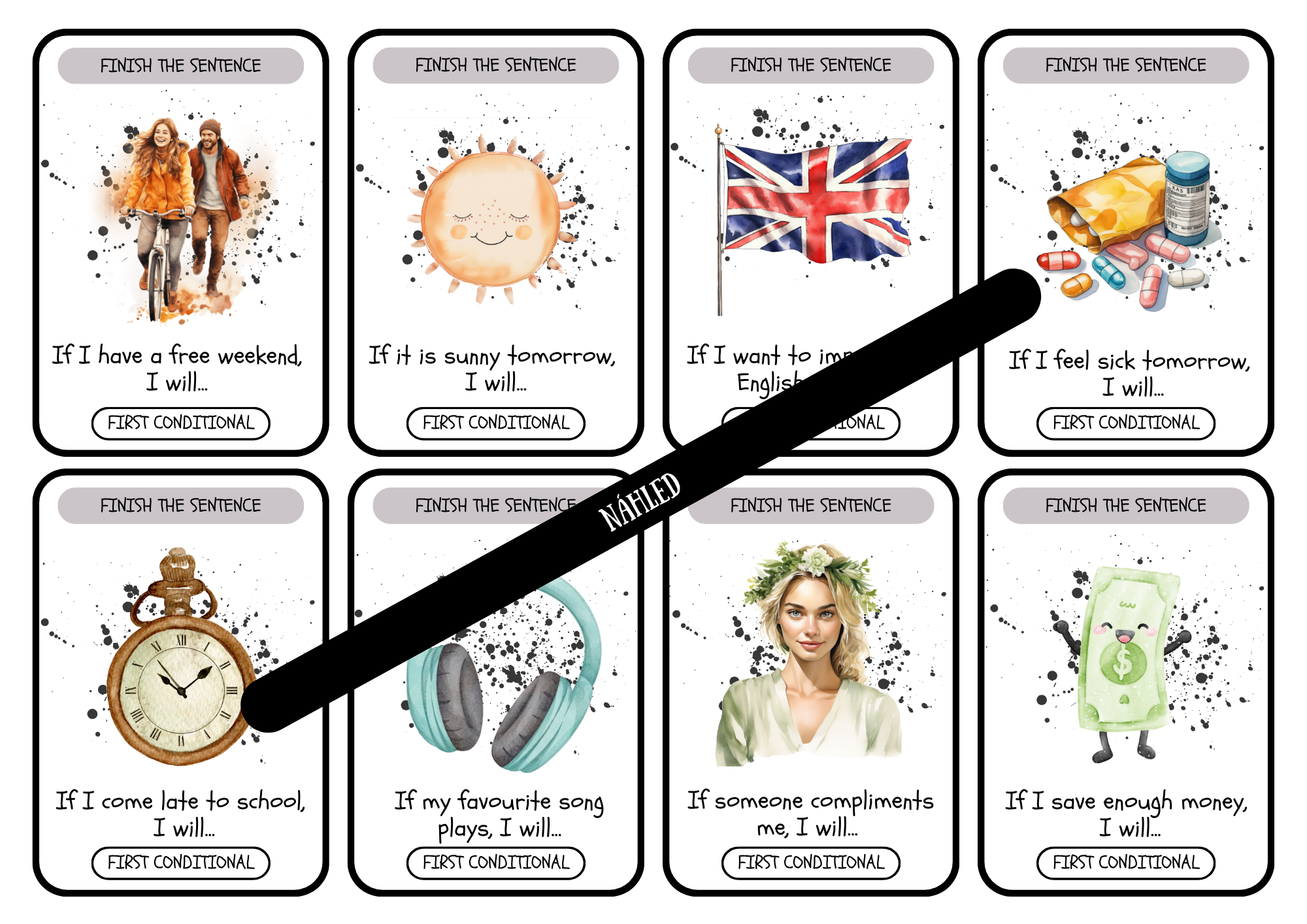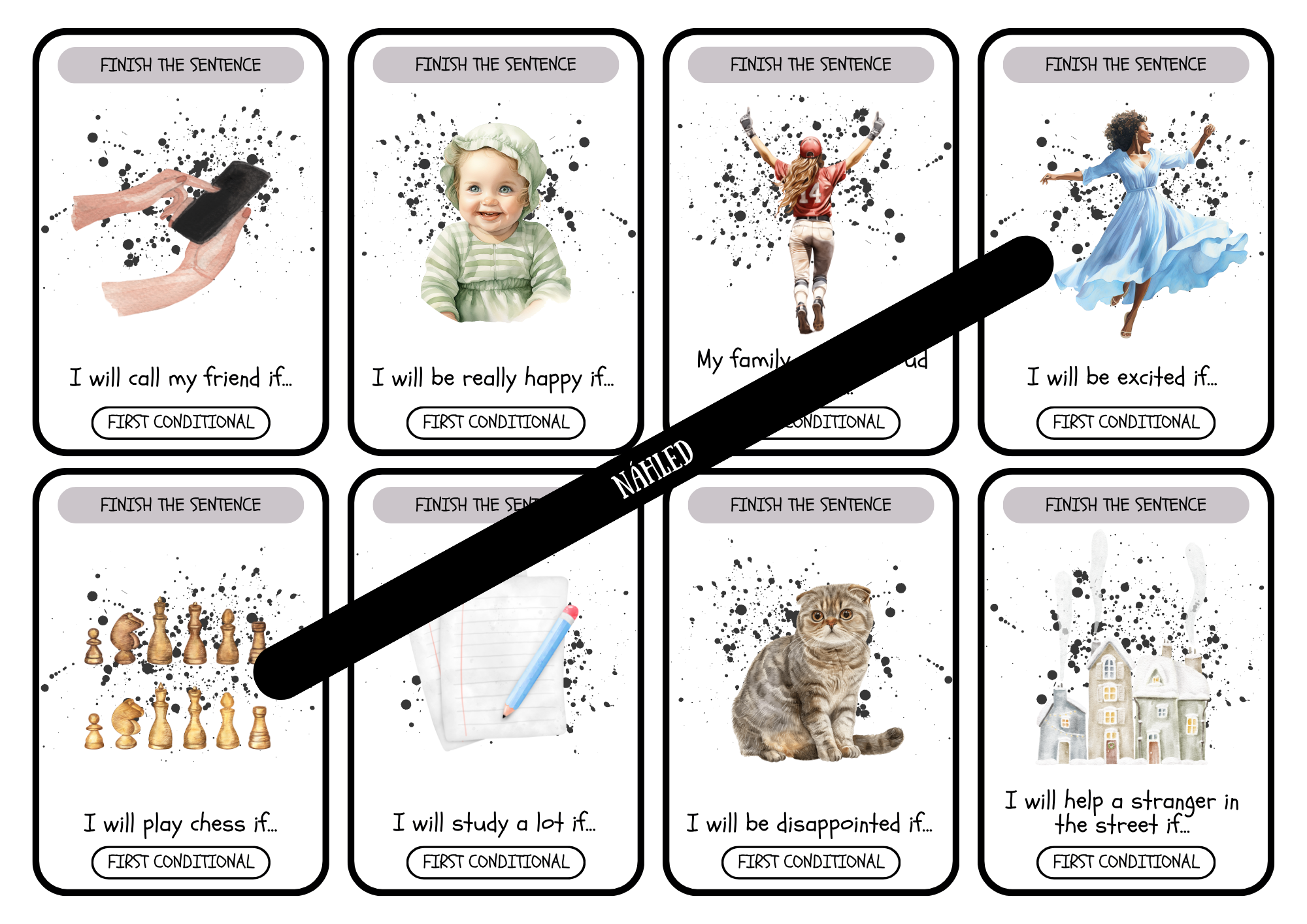 16 kartiček je zaměřeno na doplňování přítomného času prostého a 24 kartiček se zaměřuje na dokončení věty pomocí budoucího času prostého.