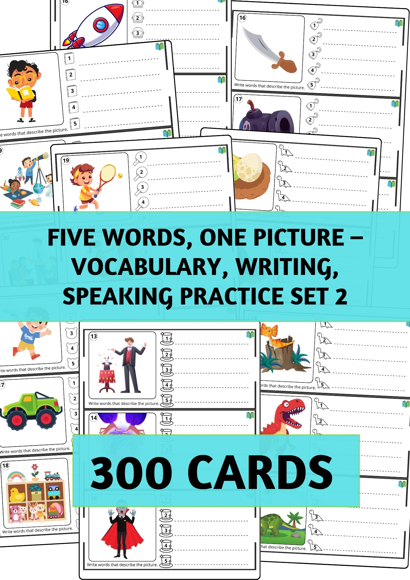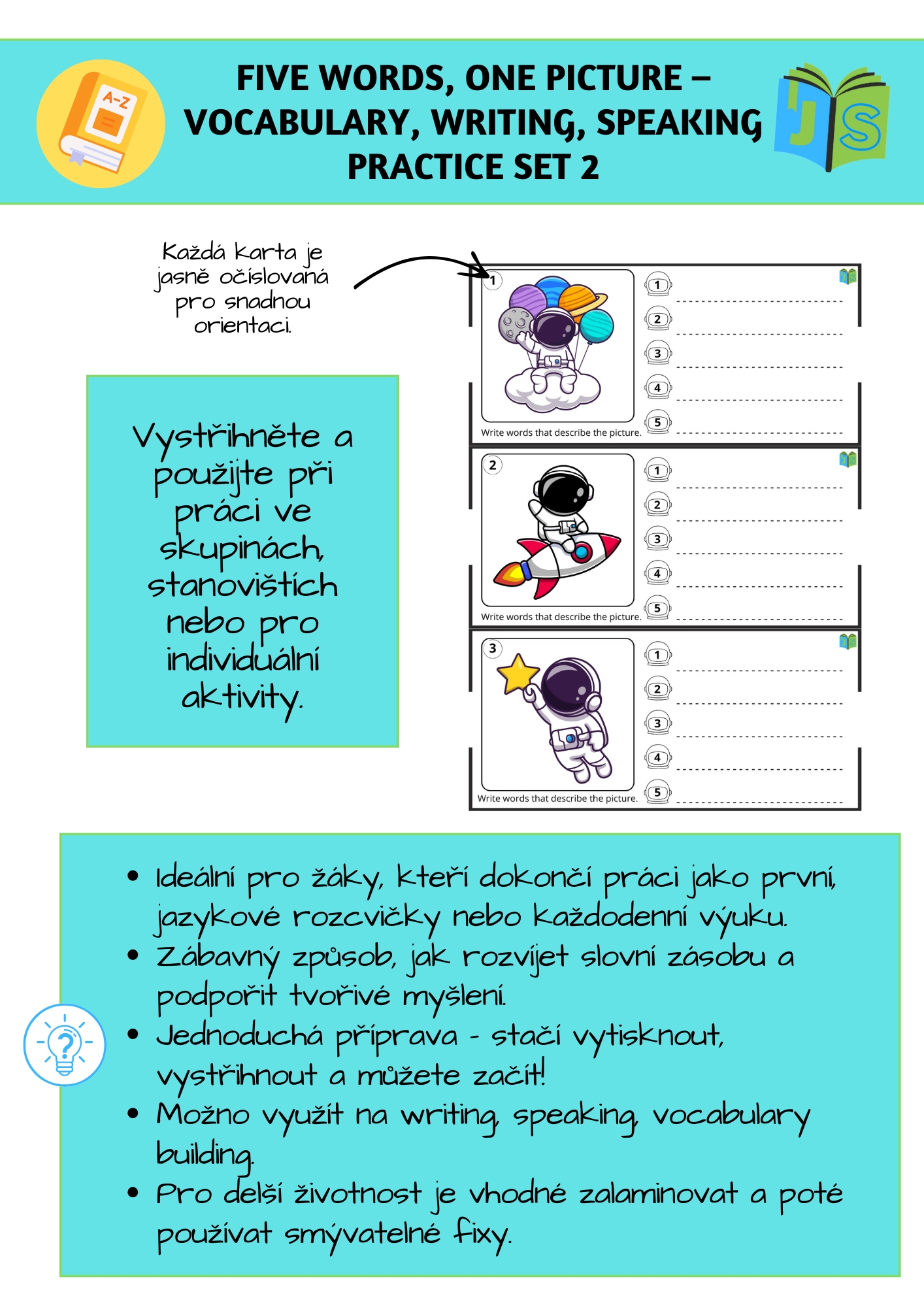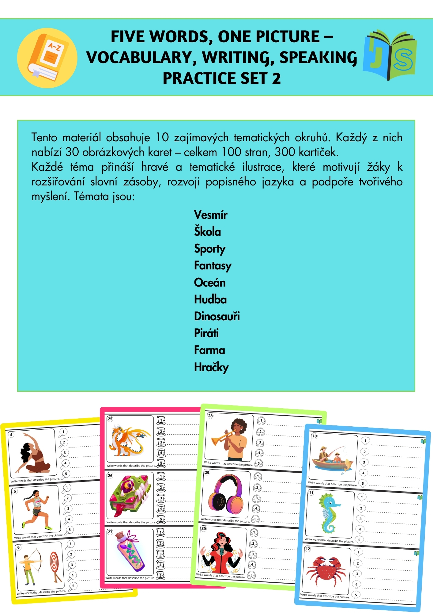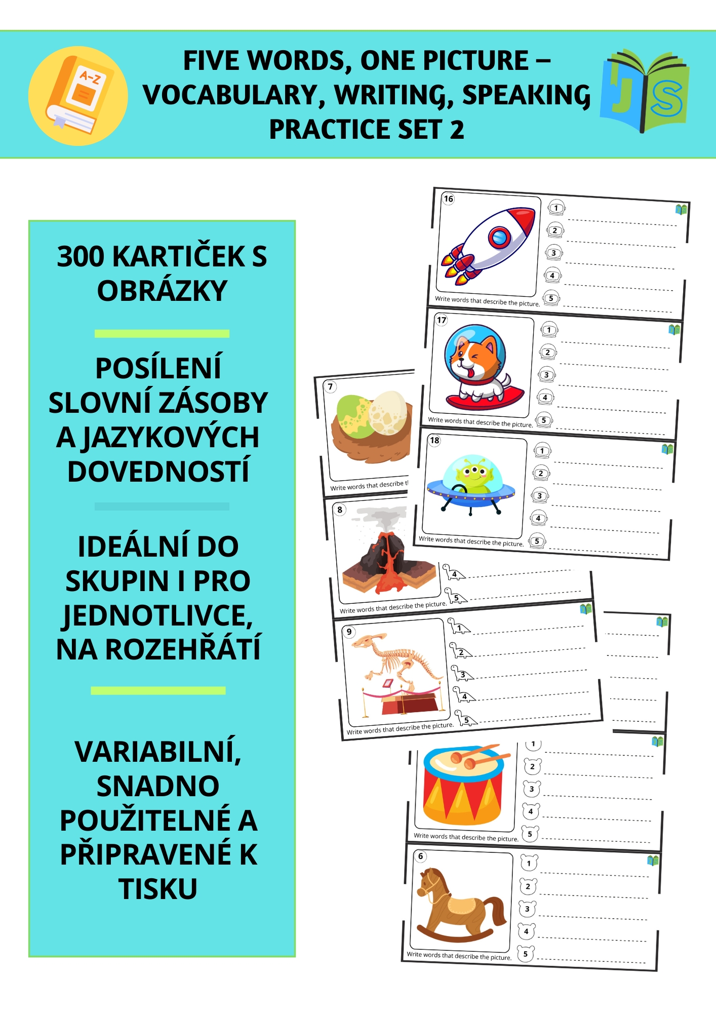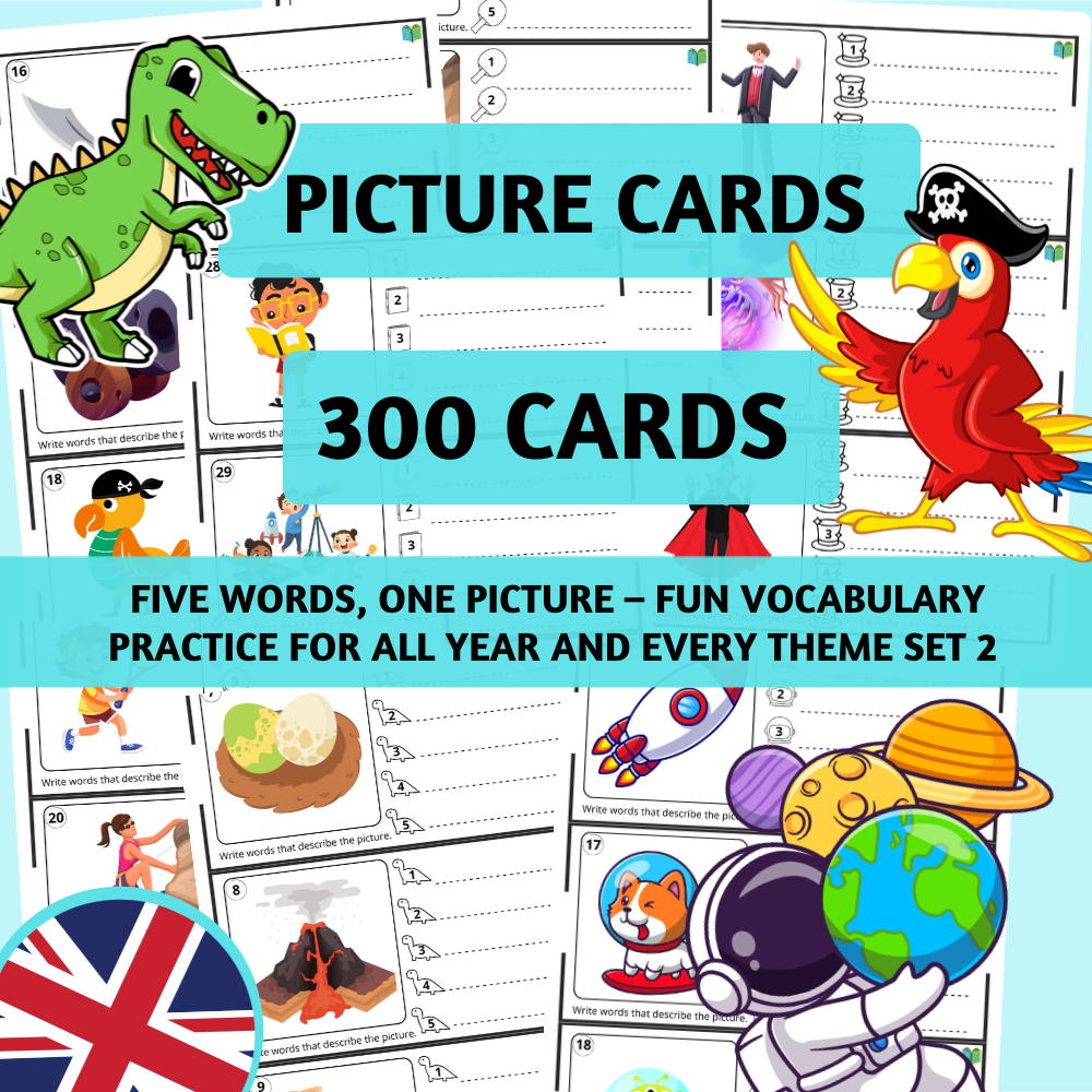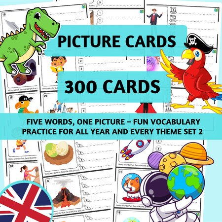 Pokračování oblíbené aktivity pro rozvoj slovní zásoby, psaní a mluvení! Tento set přináší dalších 300 obrázkových kartiček, které inspirují žáky k tvořivému vyjadřování a hravému procvičování jazyka.