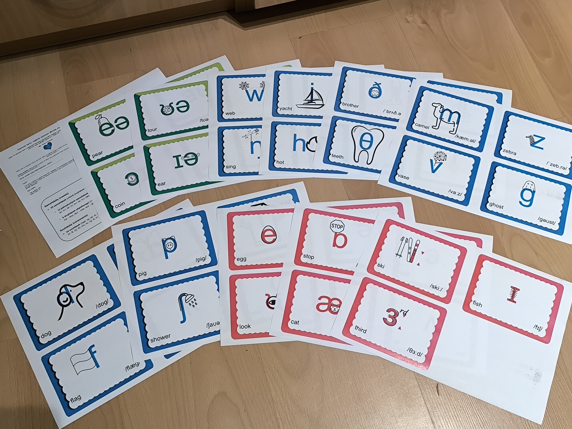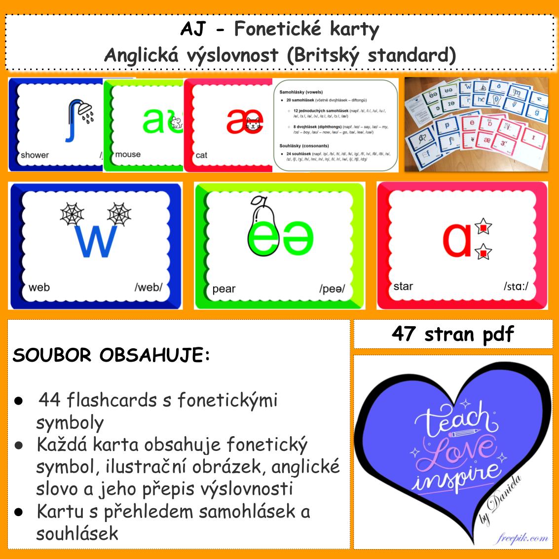 Soubor obsahuje celkem 44 fonetických symbolů rozdělených podle typu zvuků. Každá karta obsahuje fonetický symbol, ilustrační obrázek, anglické slovo a jeho přepis výslovnosti v hranatých závorkách. Materiál je určen pro výuku anglického jazyka na 1. stupni ZŠ.