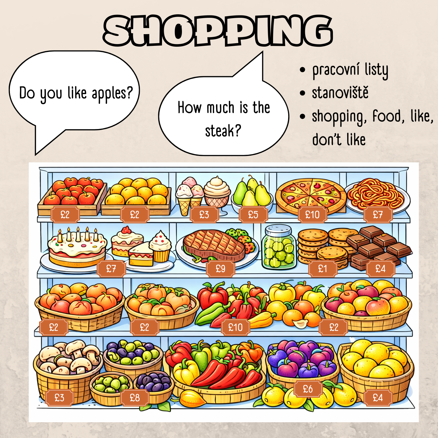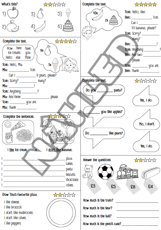 - Typy úkolů: pojmenování obrázků (What’s this?), doplňování dialogů v obchodě (Can I have…?), věty s I like / I don’t like, otázky s Do you like…?, jednoduché určování cen předmětů