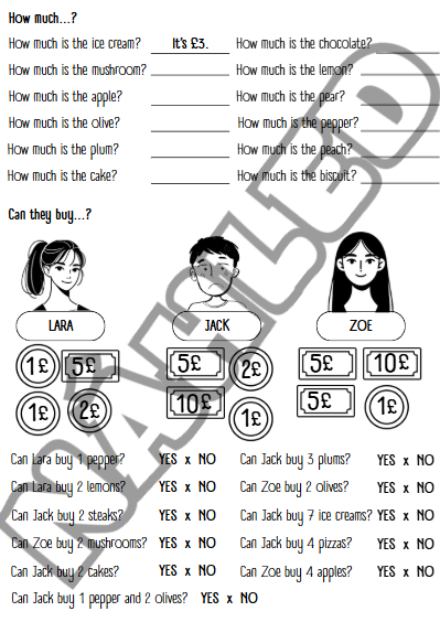 - Can they buy …? (postavy Lara, Jack, Zoe – práce s penězi)
