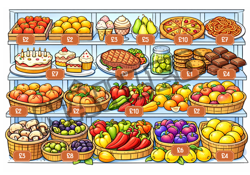 - velký obrázek obchodu s potravinami a cenami - lze ukázat na tabuli