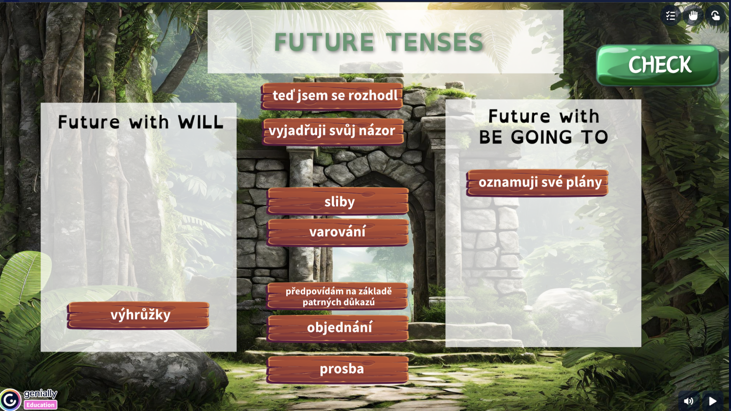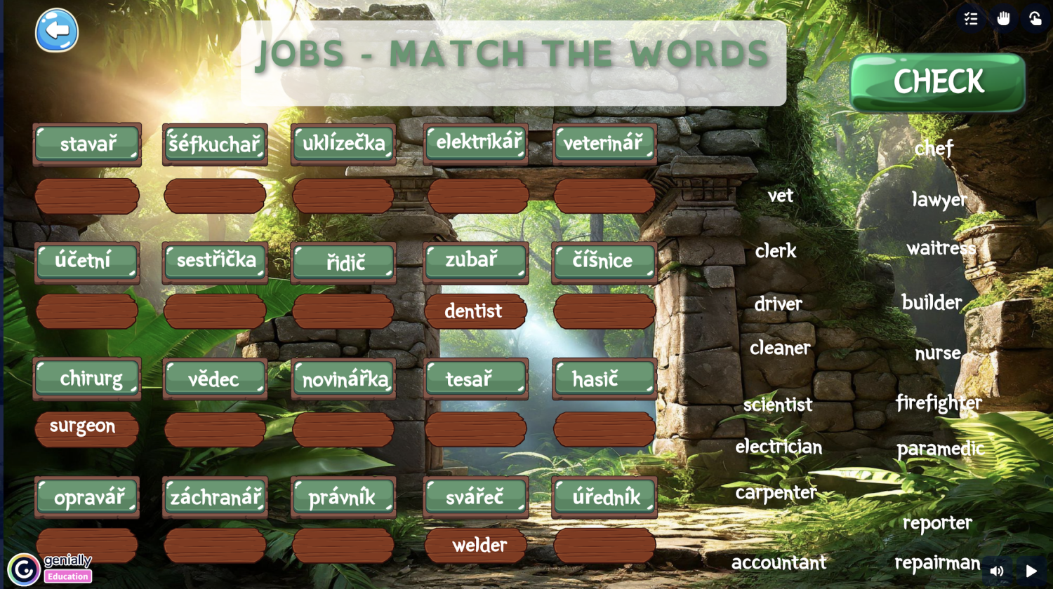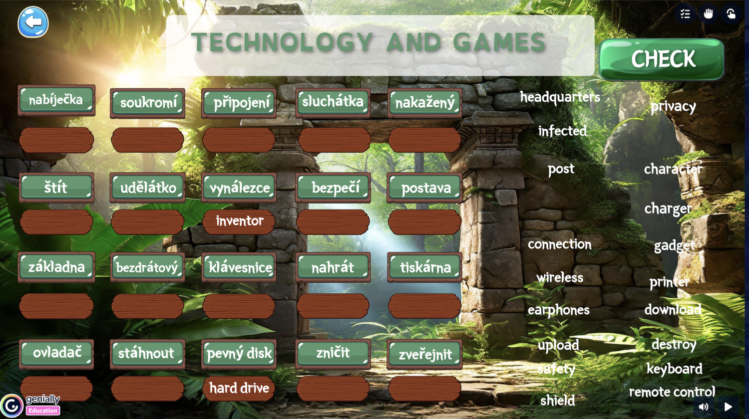 Mission 1 Jobs + Technology and games - 2 cvičení typu Drag and drop. V každém cvičení je 20 slovíček. Žák přemisťuje slova na správné místo. Špatně umístěná slovíčka se po kliknutí na Check vrátí na původní místo