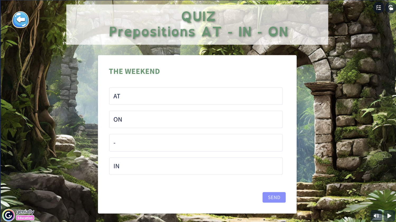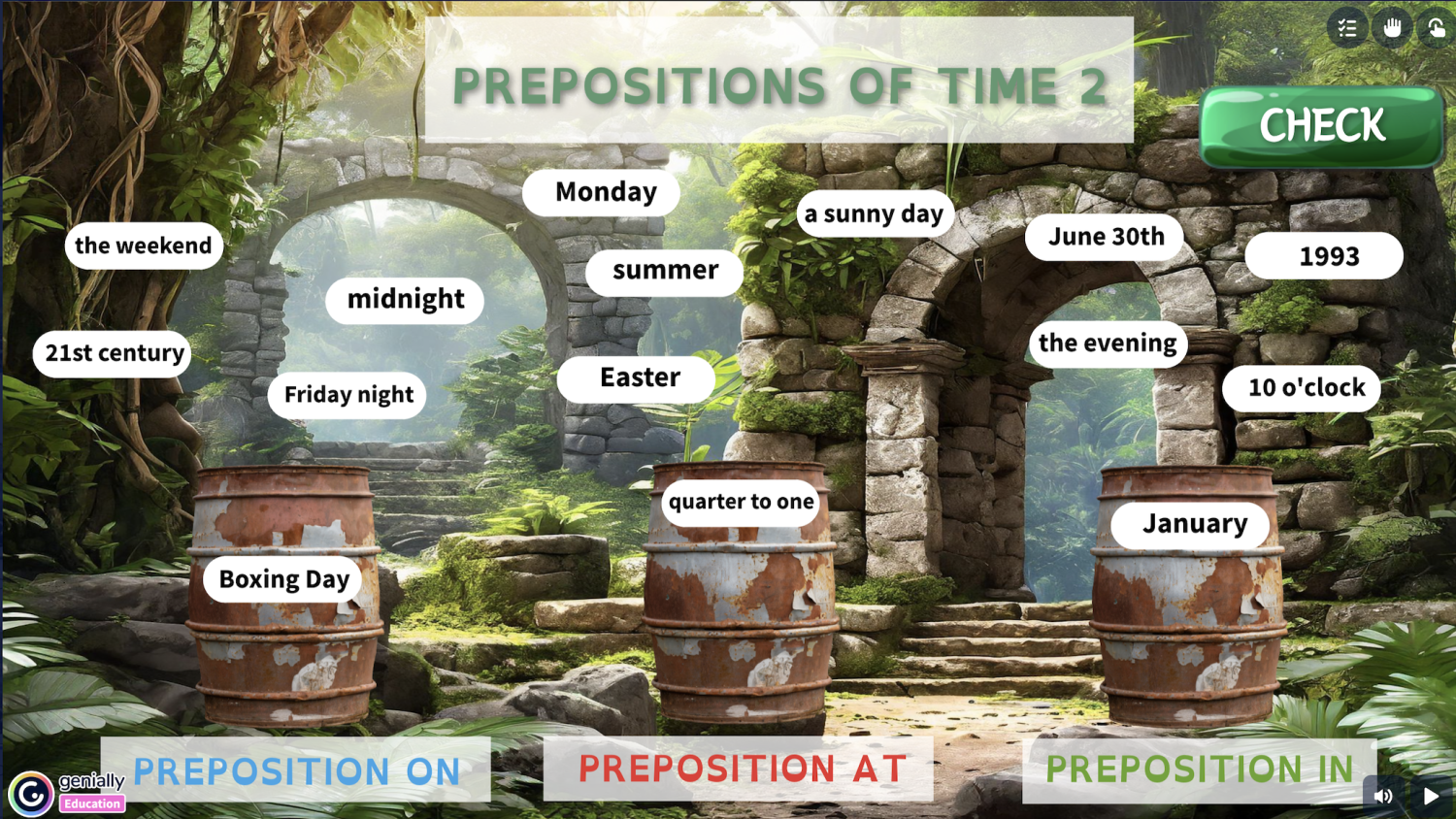 Mission 2 Prepositions of time (at, in, on) - 2 cvičení typu Drag and drop. V každém cvičení je 15 spojení. Žák je umisťuje přímo na sudy. Špatně umístěná slovíčka se po kliknutí na Check vrátí na původní místo