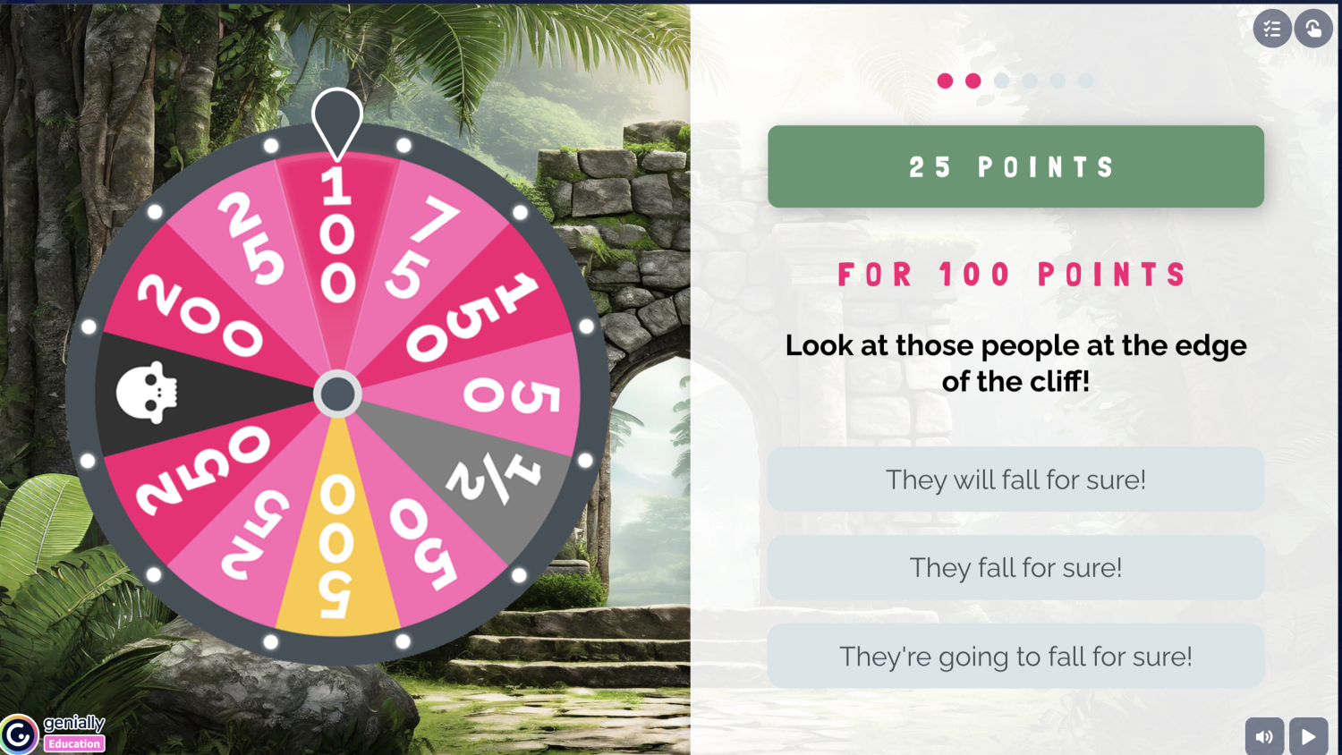 Mission 3 Will vs. Be going to - 3 cvičení; nejdříve teorie - rozdělení 9 situací, kdy se použije jedno nebo druhé spojení. Následuje Spin the wheel kdy žák točí kolem a vytočí si postupně 6 situací za určitý počet bodů. Musí se rozhodnout, který tvar použije. Následuje ještě jedno stejné cvičení tentokrát už obsahuje i present continuous. Na konci obou cvičení si může žák vybrat fiktivní cenu (např. lístek na koncert)