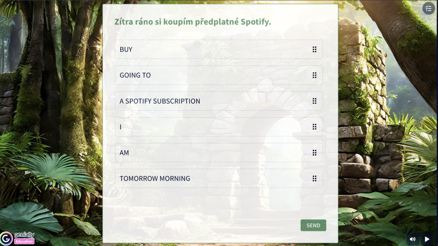 Mission 4 Word order - Quiz = 10 otázek na future tenses, kde žák přesunuje slova do správného slovosledu