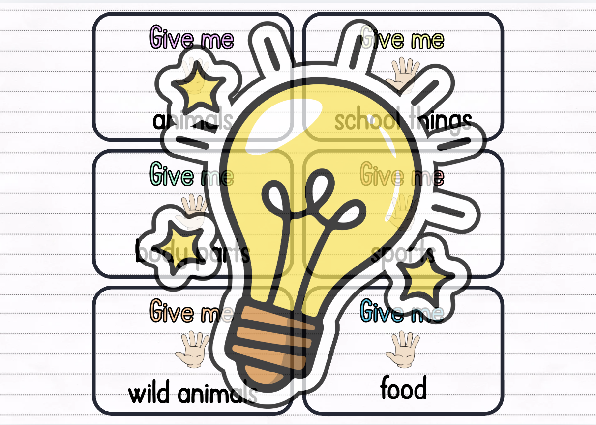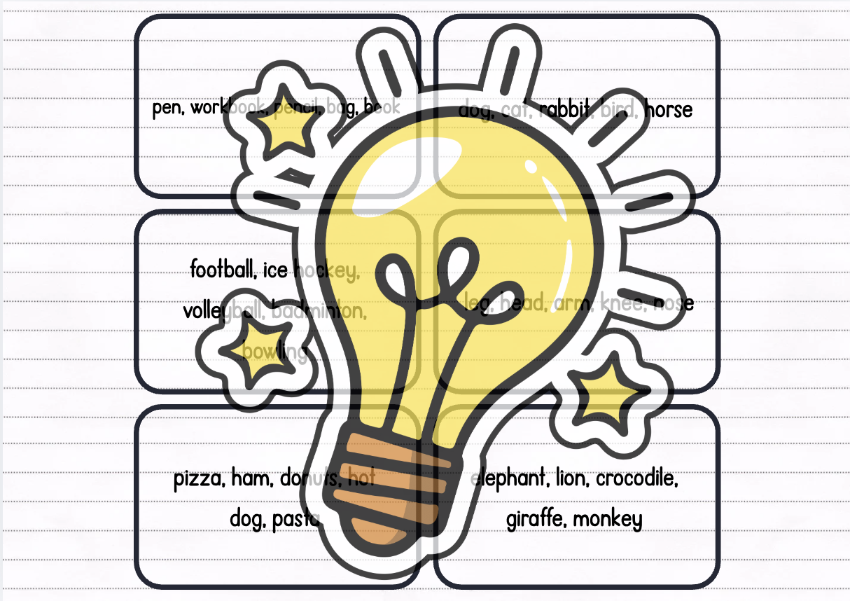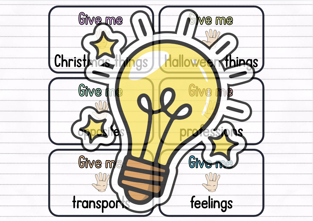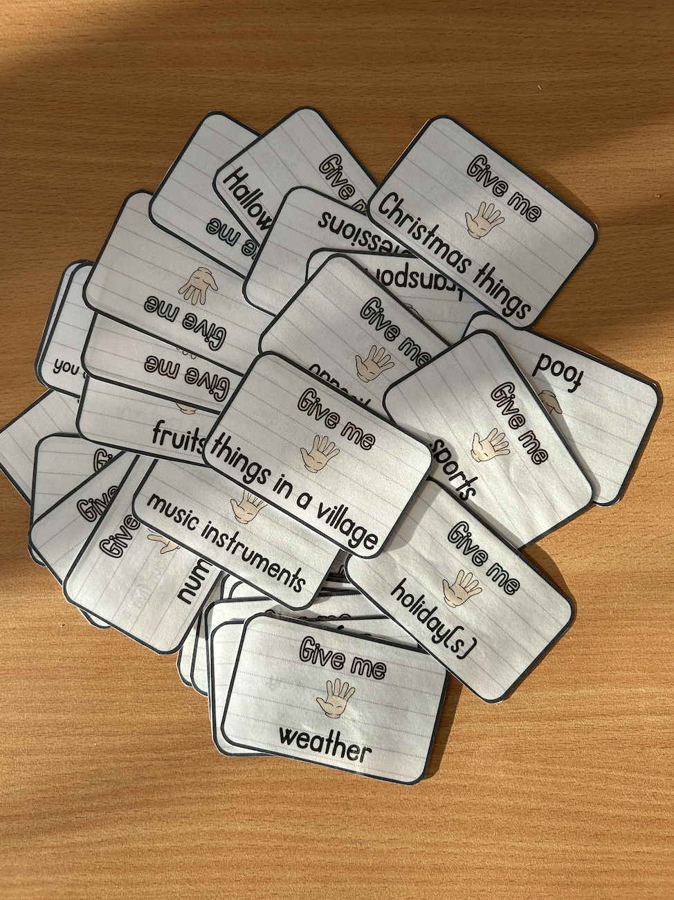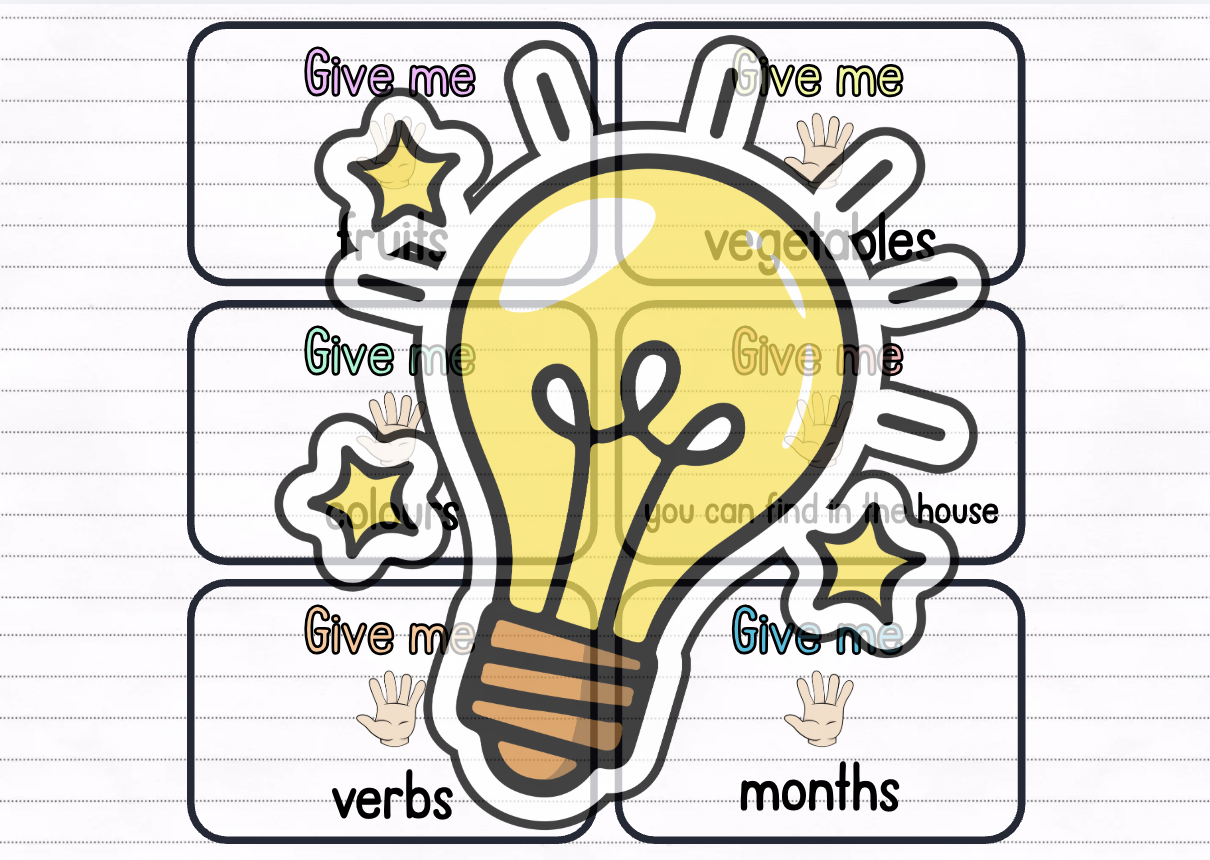 Děti rozdělte do menších skupin. Každé skupině rozdejte balíček kartiček a položte jej doprostřed. Děti se ve skupině střídají a navzájem si dávají pokyn: „Give me five …“ (např. animals, colours, food apod.). Pokud dítě správně vyjmenuje pět slov z dané oblasti, získává bod. Poté pokračuje další hráč. Hra končí ve chvíli, kdy jsou vyčerpány všechny kartičky z balíčku, nebo když některý z hráčů dosáhne předem stanoveného počtu bodů.