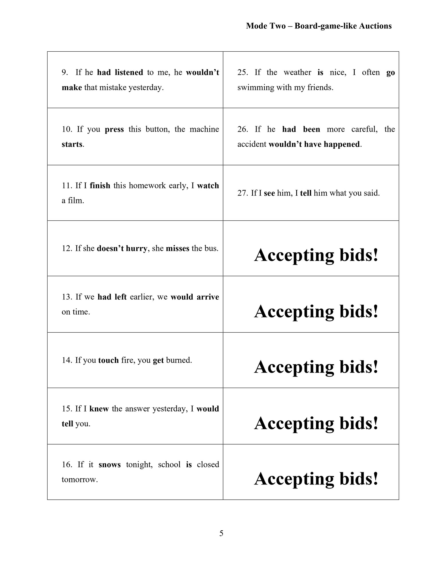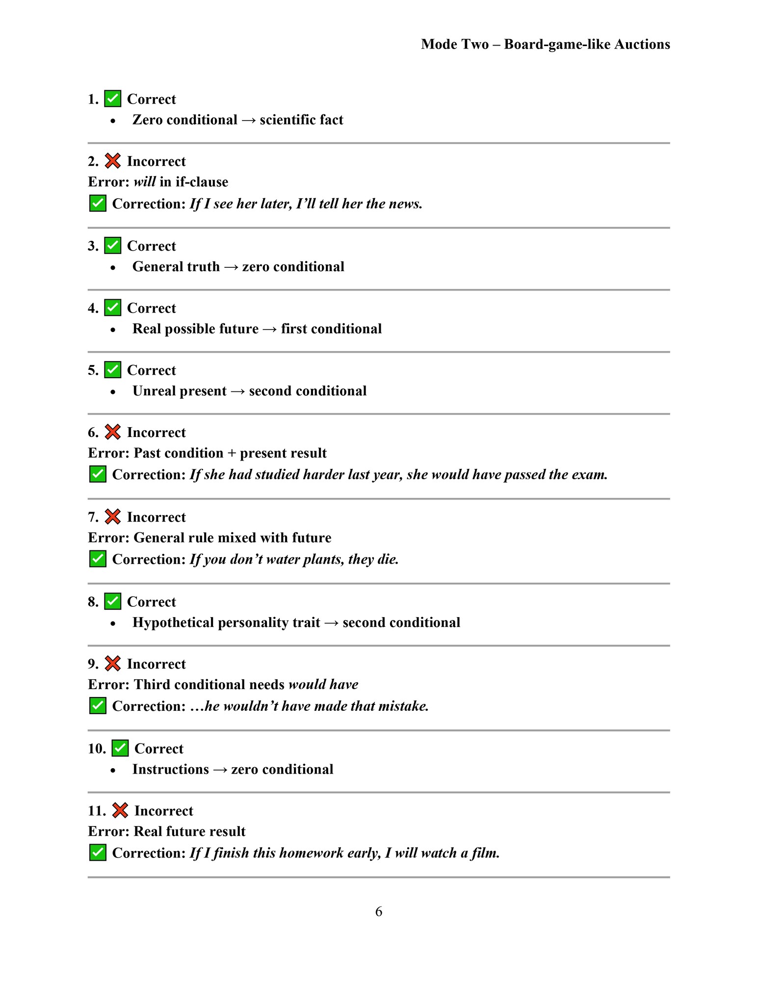 Tento materiál je zaměřený na používání nultého, prvního, druhého a třetího kondicionálu v angličtině. Pomocí aukční aktivity si studenti procvičí rozlišení správných a chybných vět a naučí se argumentovat, obhajovat svůj názor a přemýšlet nad významem, ne jen nad „pravidlem“. Materiál podporuje kritické myšlení, diskuzi a aktivní zapojení všech studentů.