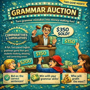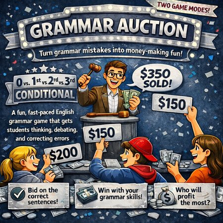 Máte už dost Kahootu? Tento materiál nabízí zábavnou aukční aktivitu zaměřenou na kondicionály v angličtině. Studenti v aukcích soutěží o správné věty a obhajují svá rozhodnutí čímž se učí gramatiku v kontextu. Dva herní módy.