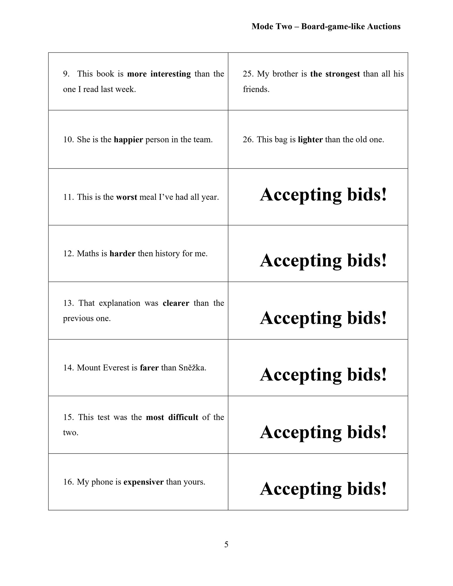 Tento materiál je zaměřený na používání komparativů a superlativů v angličtině. Pomocí aukční aktivity si studenti procvičí rozlišení správných a chybných vět a naučí se argumentovat, obhajovat svůj názor a přemýšlet nad významem, ne jen nad „pravidlem“. Materiál podporuje kritické myšlení, diskuzi a aktivní zapojení všech studentů.