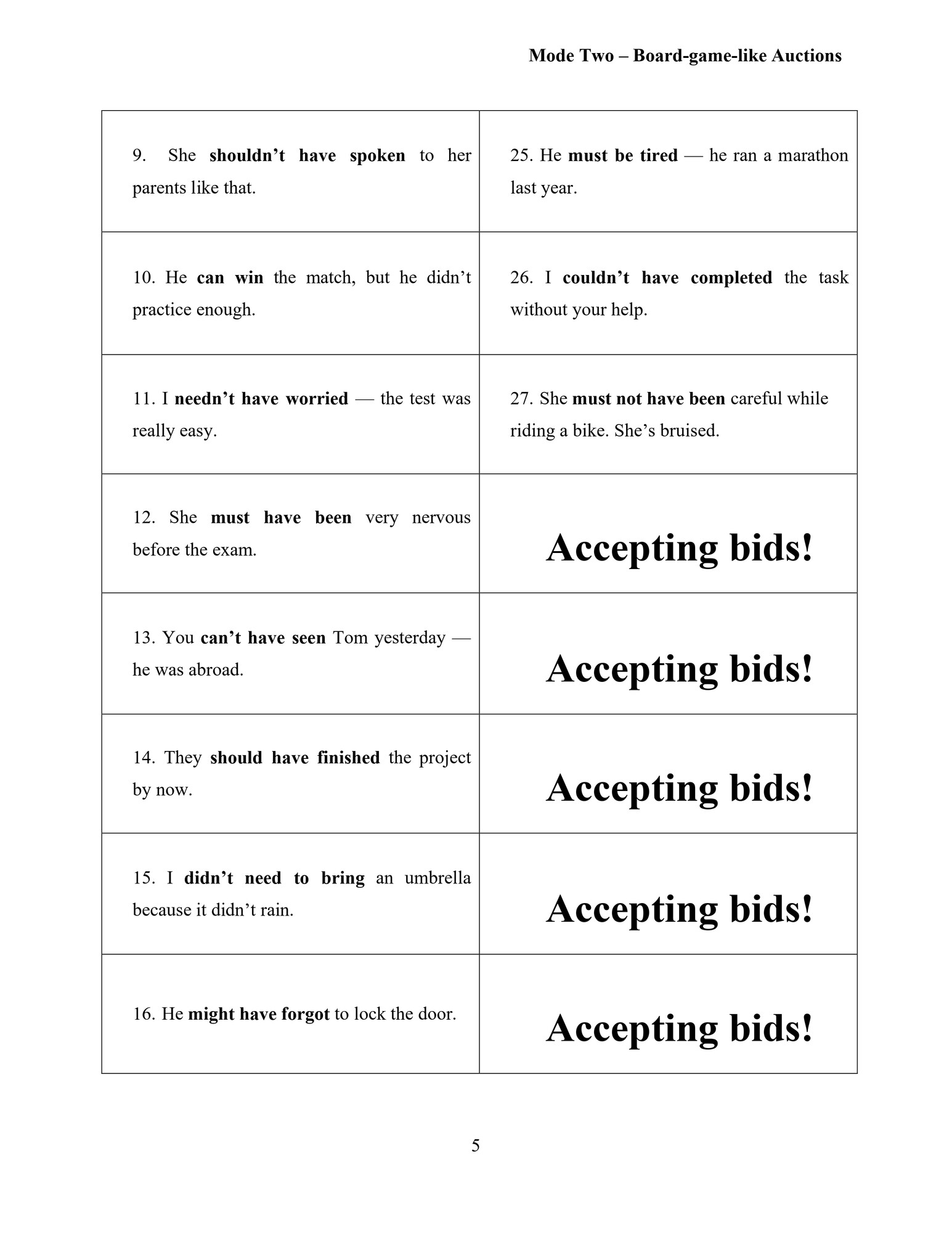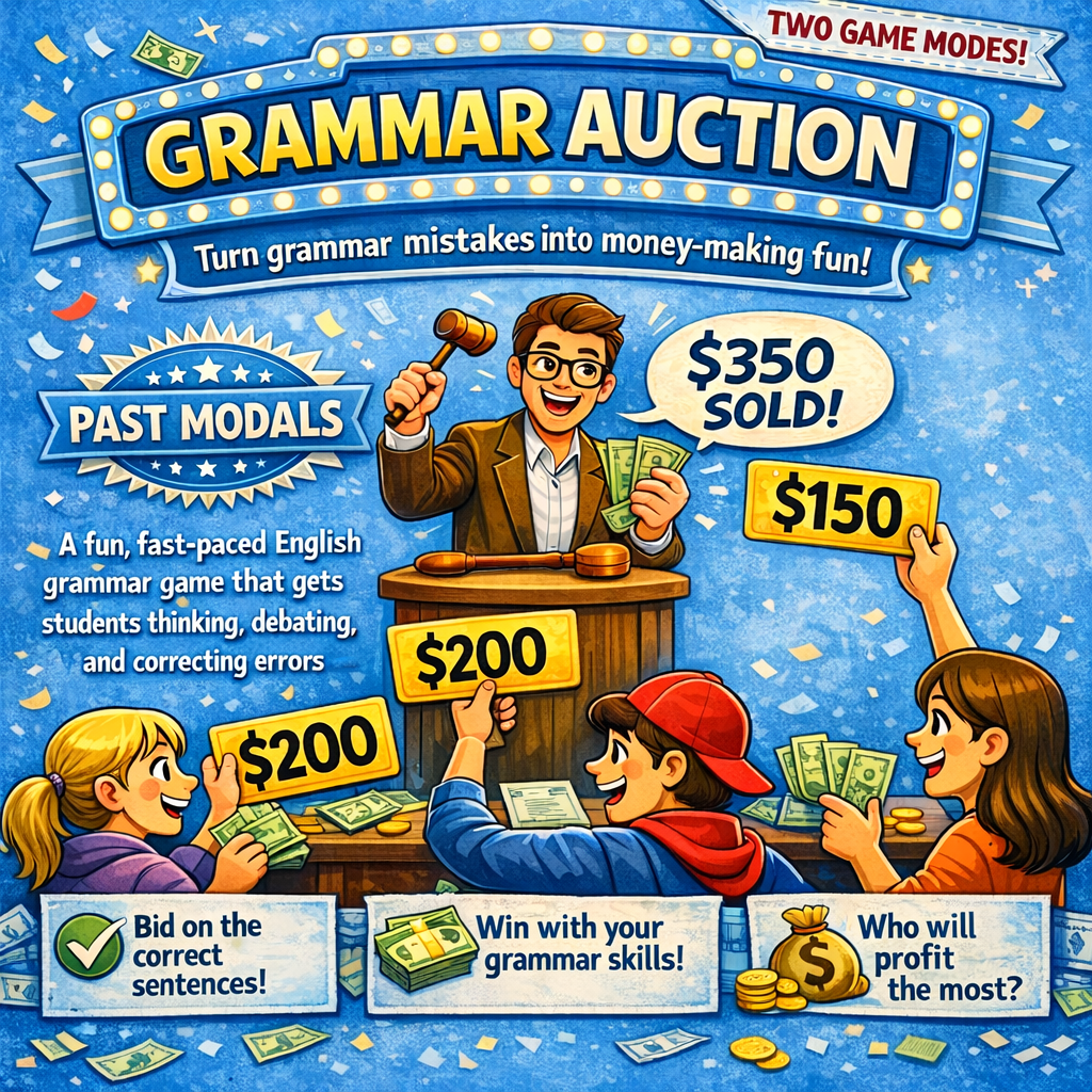 Máte už dost Kahootu? Tento materiál nabízí zábavnou aukční aktivitu zaměřenou na minulá modální slovesa v angličtině. Studenti v aukcích soutěží o správné věty a obhajují svá rozhodnutí čímž se učí gramatiku v kontextu. Dva herní módy.