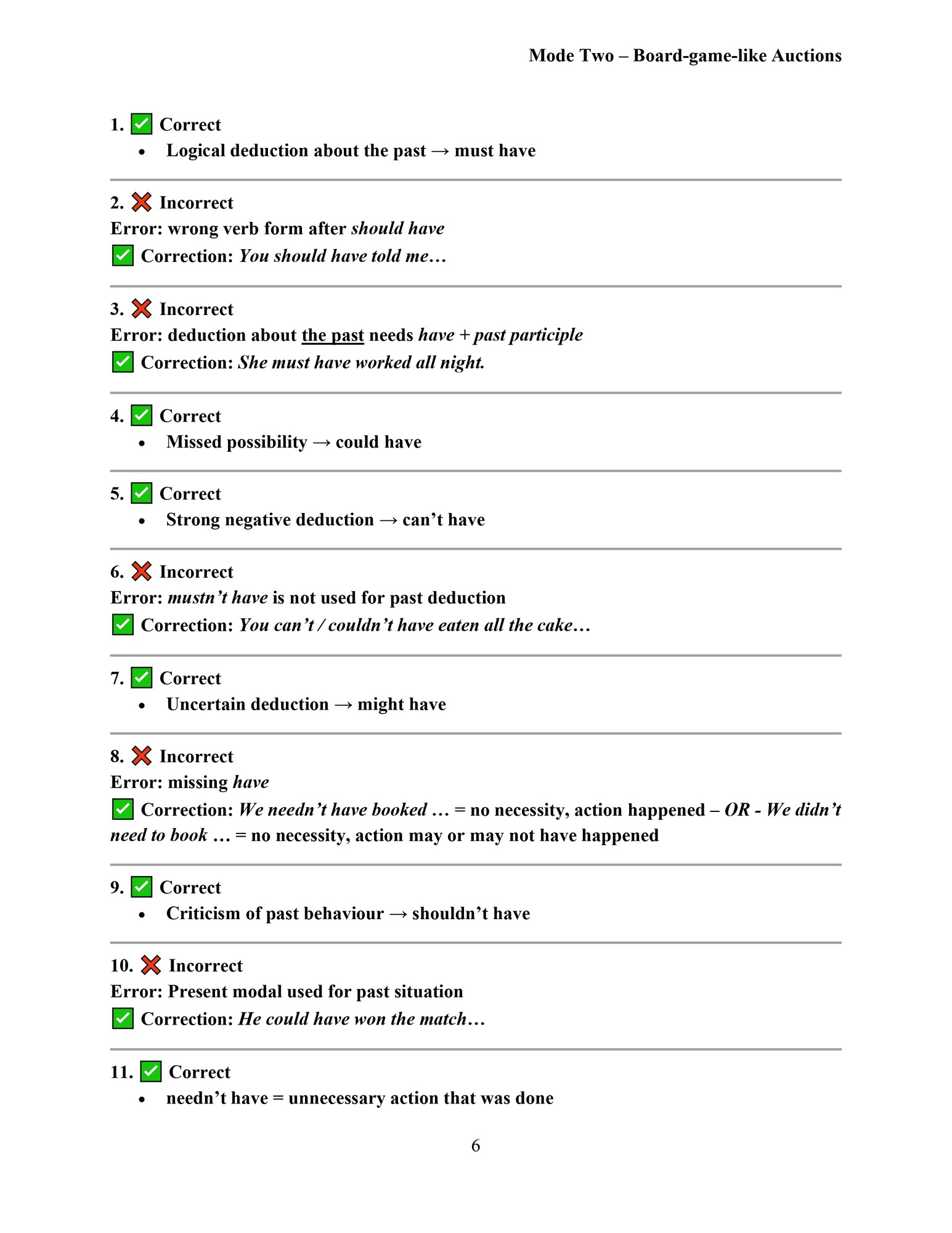 Tento materiál je zaměřený na používání minulých modálních sloves v angličtině. Pomocí aukční aktivity si studenti procvičí rozlišení správných a chybných vět a naučí se argumentovat, obhajovat svůj názor a přemýšlet nad významem, ne jen nad „pravidlem“. Materiál podporuje kritické myšlení, diskuzi a aktivní zapojení všech studentů.