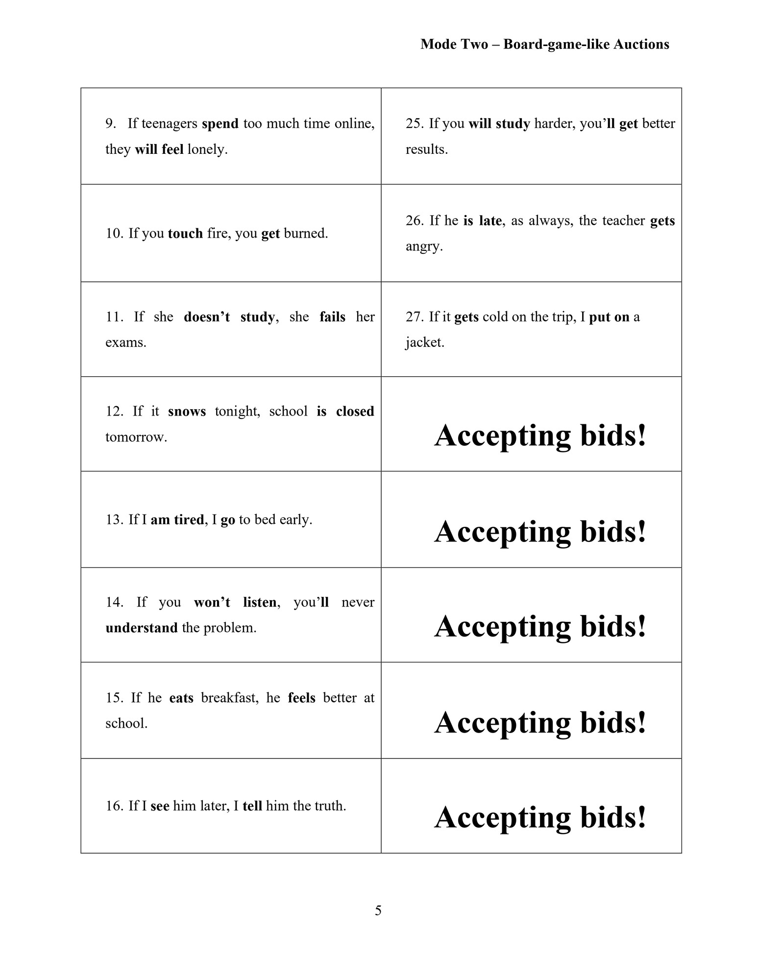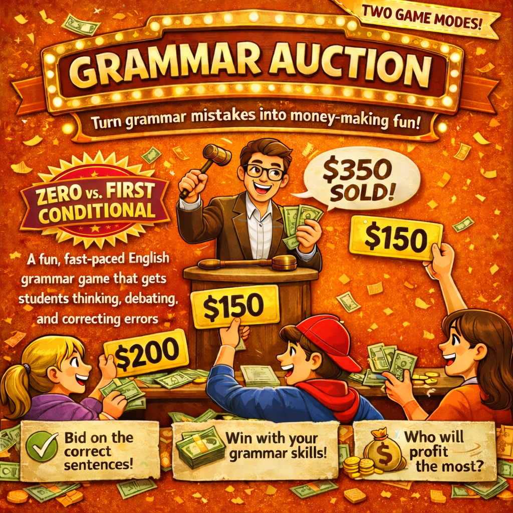 Máte už dost Kahootu? Tento materiál nabízí zábavnou aukční aktivitu zaměřenou na nultý a první kondicionál v angličtině. Studenti v soutěží o správné věty a později obhajují svá rozhodnutí čímž se učí gramatiku v kontextu. Hra má dva módy.