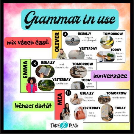 Rozmluvte žáky pomocí návodný karet. Set obsahuje kartičky na procvičení časů (minulý, přítomný, budoucí - present simple, past simple, future tense, present continuous). Lze využít jako běhací diktát nebo podklady pro konverzaci.