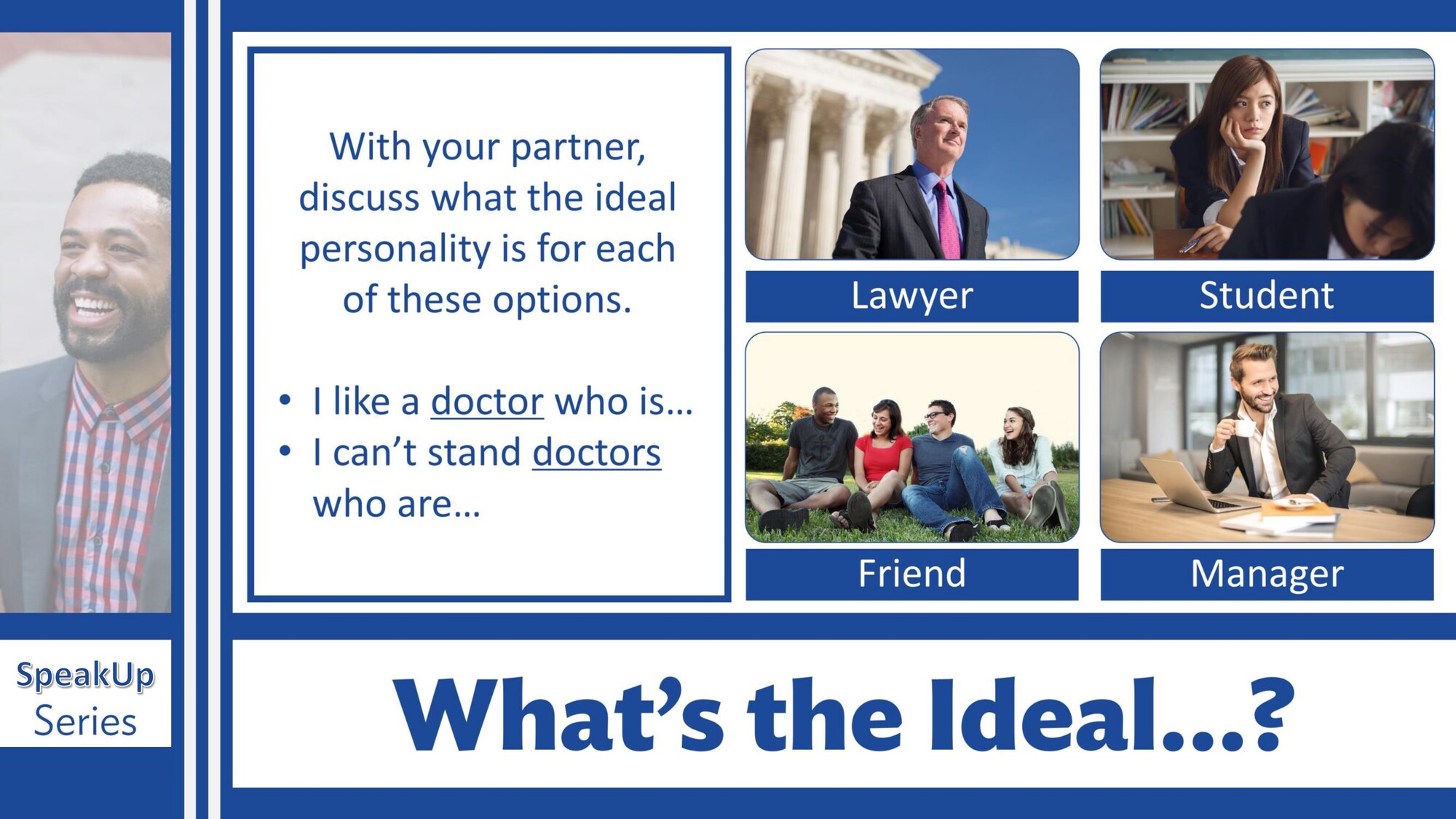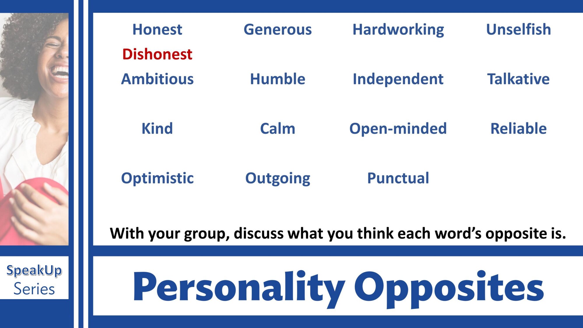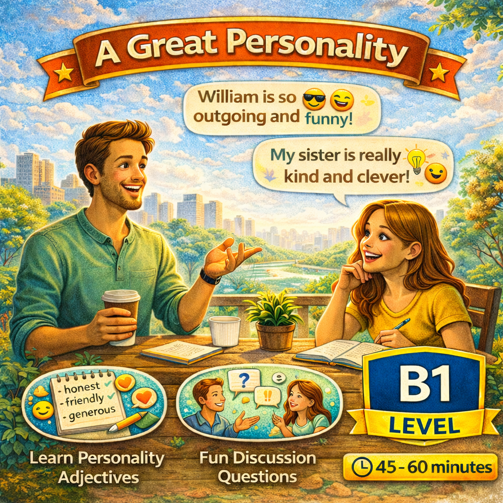 Materiál A Great Personality série SpeakUp se zaměřuje na popis osobnosti a charakterových vlastností. Studenti si procvičí přídavná jména pro povahu a naučí se mluvit o lidech, které obdivují.