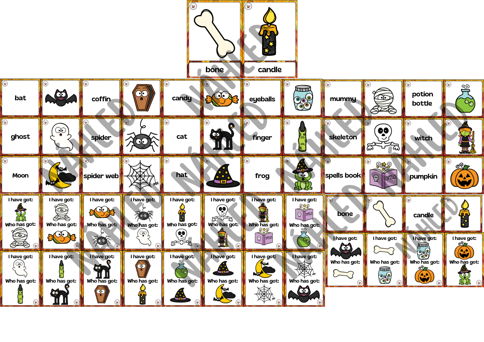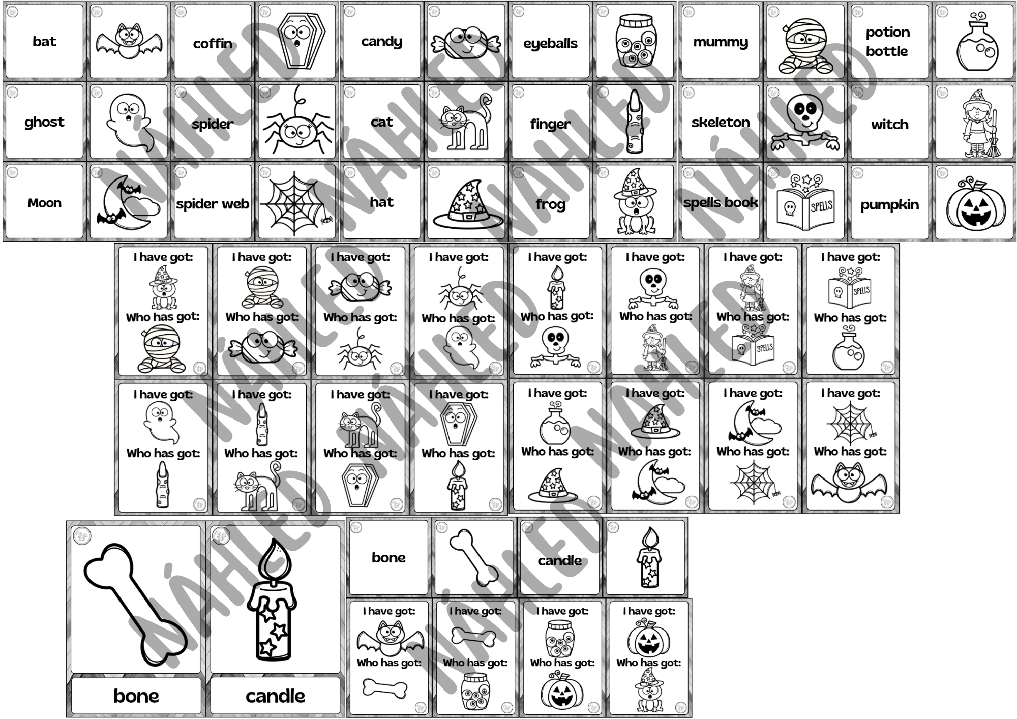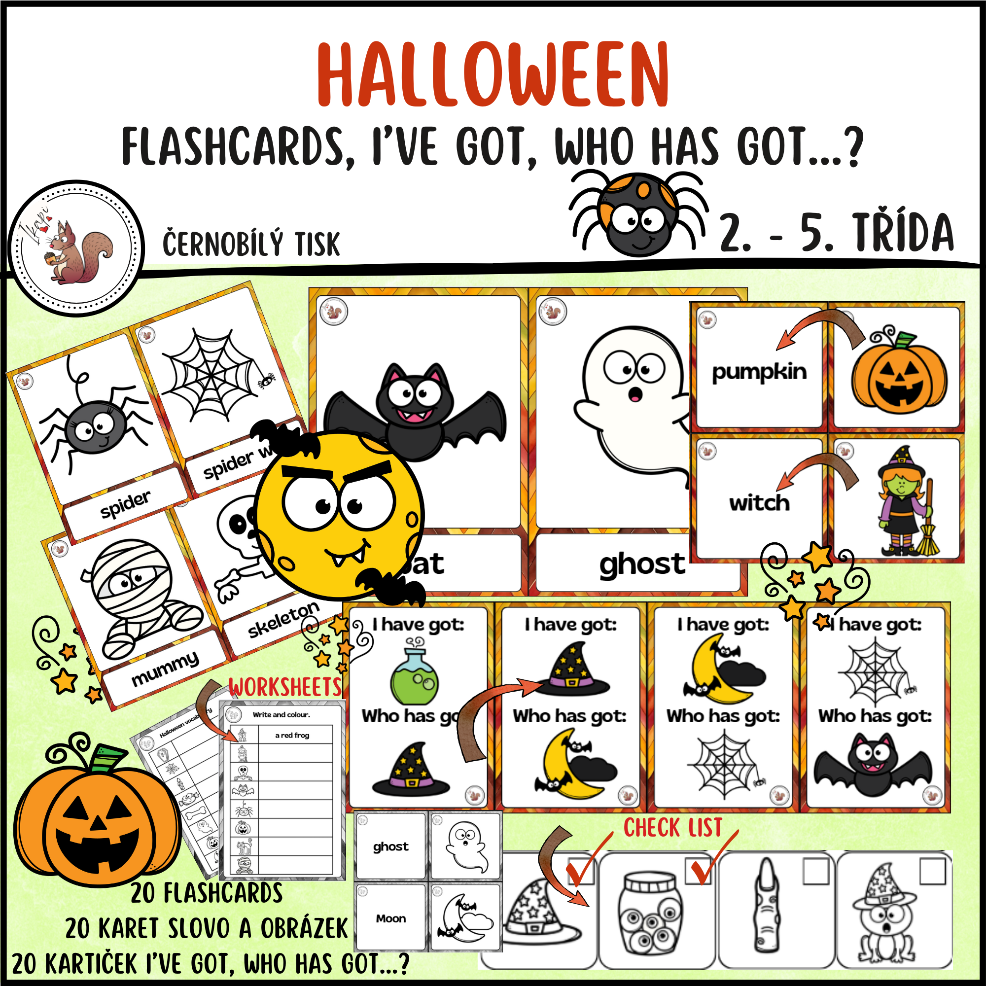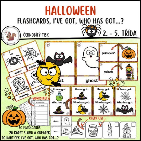 Soubor obsahuje 20 barevných demonstračních karet s obrázky patřícími k svátku Halloween, 20 dvojic kartiček s obrázkem a slovem, 20 kartiček Já mám, kdo má? Všechny barevné karty jsou rovněž v černobílém provedení. Kontrolníček pro zaškrtnutí slovíček, která žáci už ovládají.