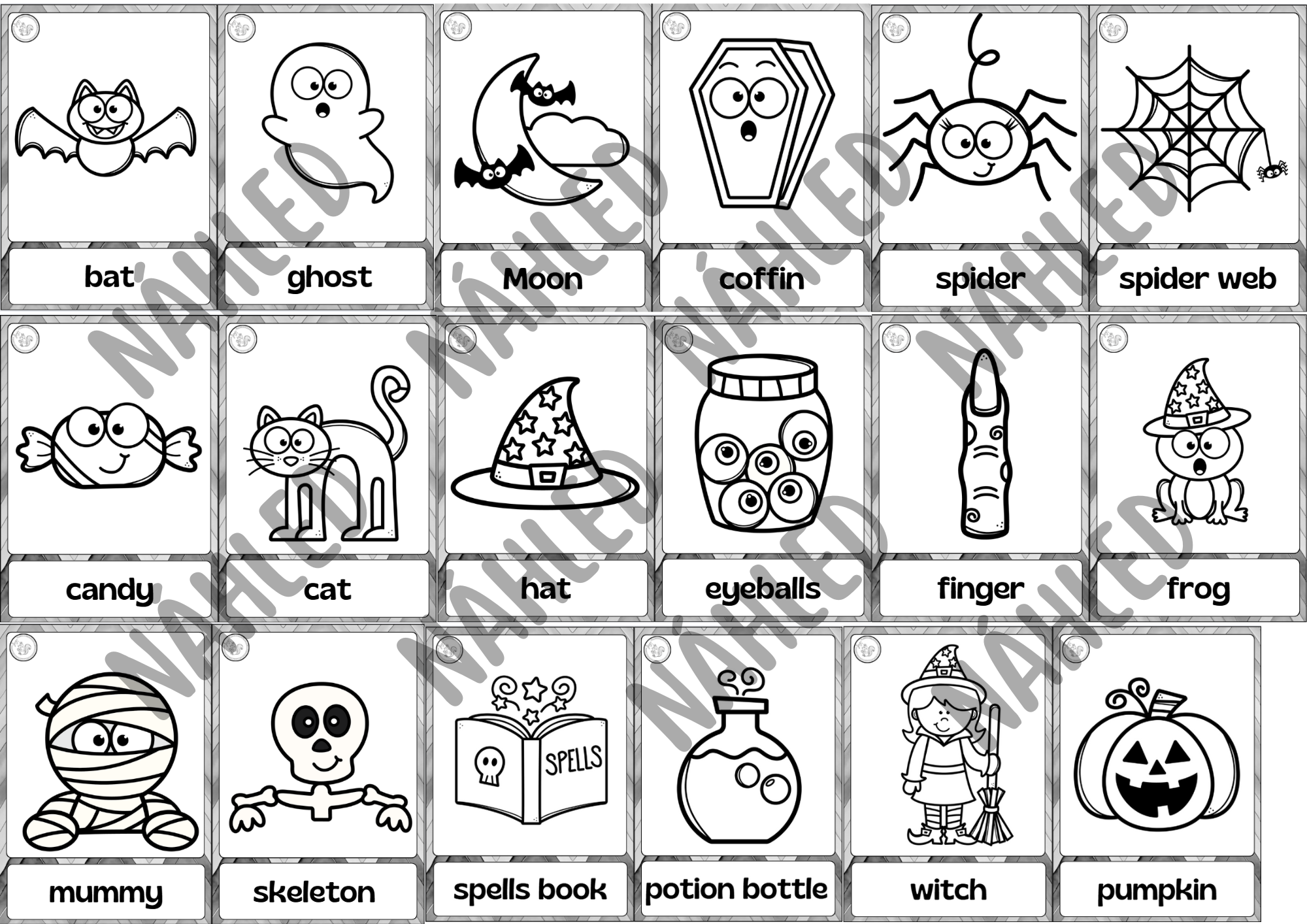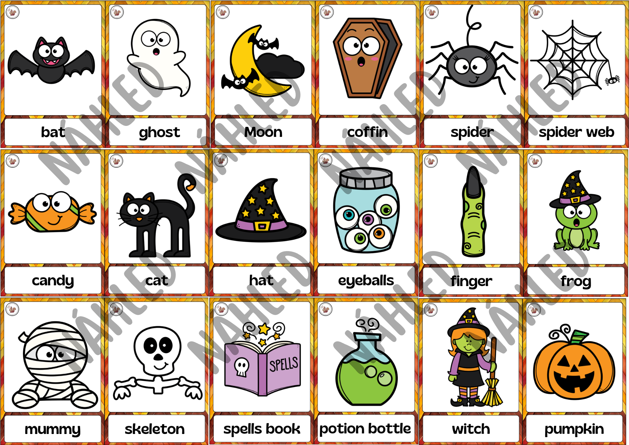 Žáci přikládají obrázek ke slovu a opačně, této činnosti použijeme karty s obrázkem a slovem. Žáci mají kartičky v lavici, můžeme se jich dotazovat, žáci mohou podle kartiček vytvářet věty dle potřeby. Např. I have got a white ghost. I can see an orange pumpkin etc. Můžete se rovněž dotazovat. Have you got a spider? What colour is the bat? atd. Alternativou pro tyto kartičky je hra tradičního pexesa.