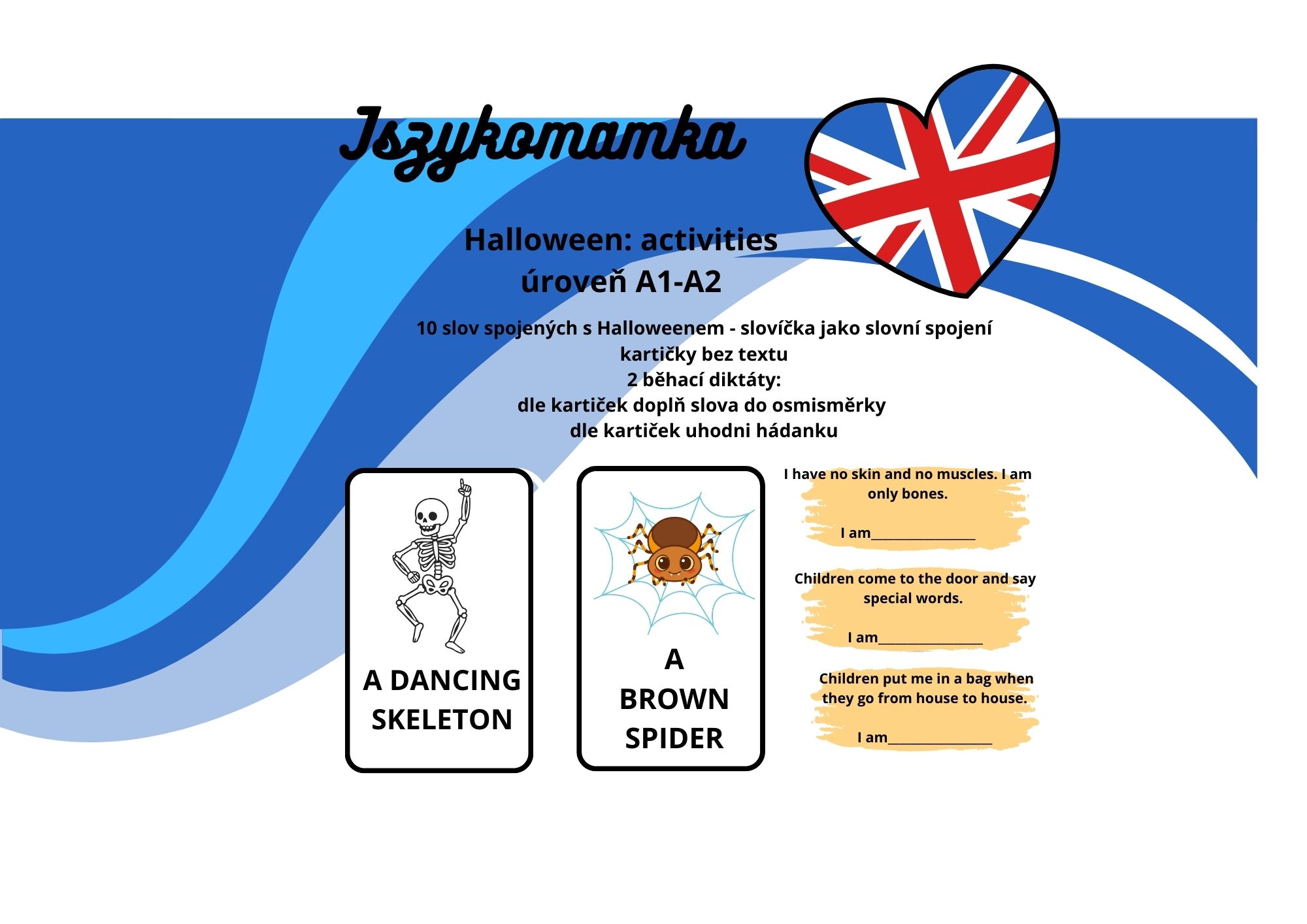 - Kartičky s textem - pro třetí/čvrtou třídu, můžete předem procvičit “word chunks”, k tomu je běhací diktát - děti mají osmisměrku a buď ve dvojicích nebo každý sám chledají slova a ověřují si je na kartičkách rozmístěných po třídě/škole