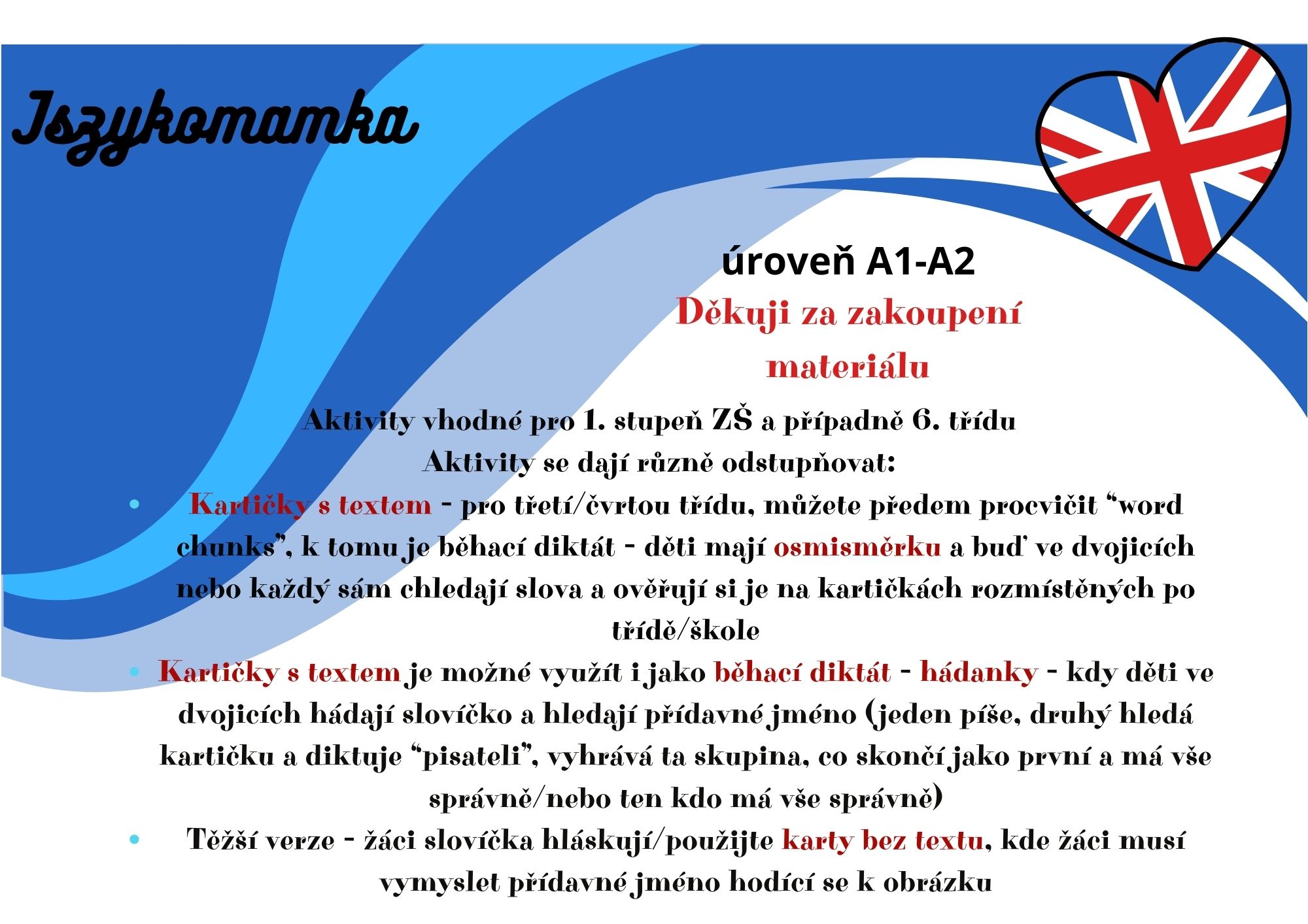 - Těžší verze - žáci slovíčka hláskují/použijte karty bez textu, kde žáci musí vymyslet přídavné jméno hodící se k obrázku
