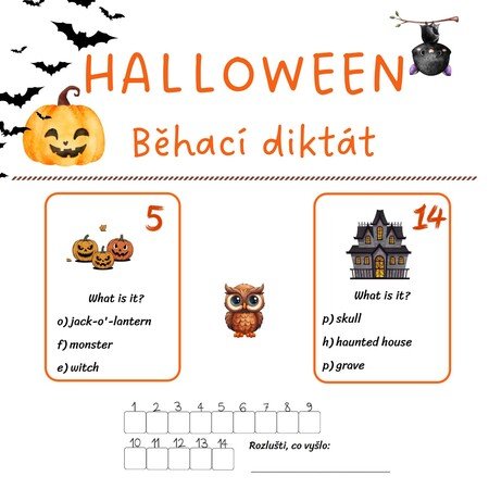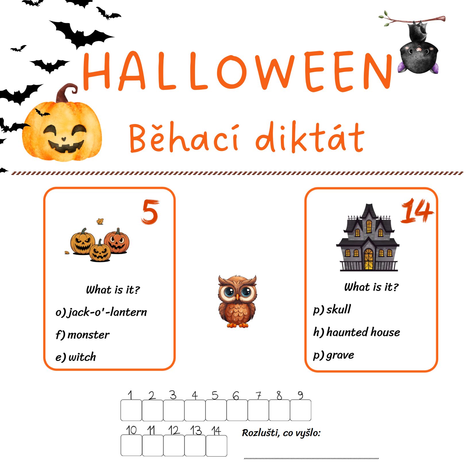 Běhací diktát na téma Halloween, včetně záznamového archu. Aktivita je vhodná pro výuku angličtiny, rozvíjí slovní zásobu, čtení, psaní i pohyb.