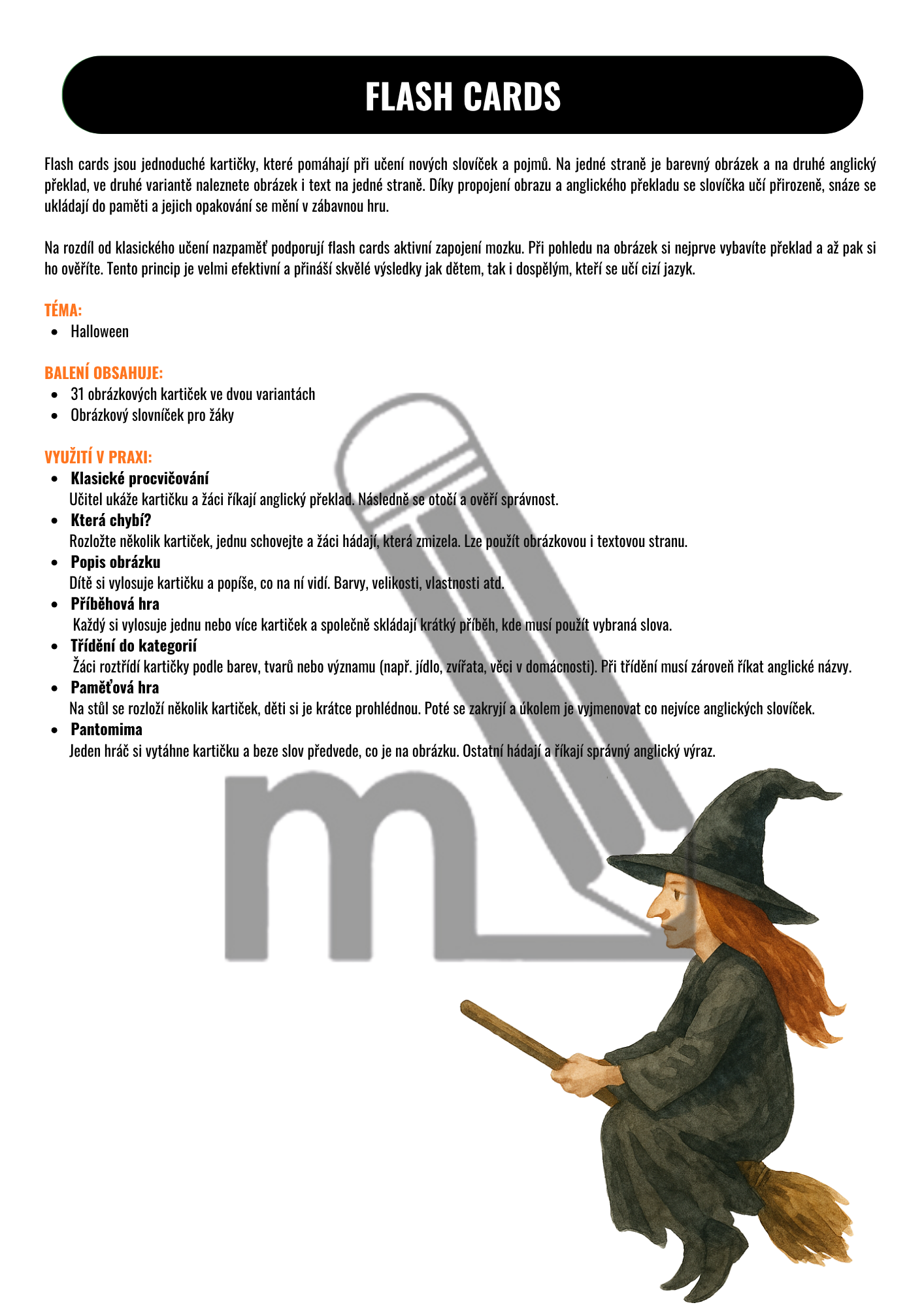 Flash cards jsou jednoduché kartičky, které pomáhají při učení nových slovíček a pojmů. Na jedné straně je barevný obrázek a na druhé anglický překlad. Ve druhé variantě naleznete obrázek i text na jedné straně. Díky propojení obrazu a anglického překladu se slovíčka učí přirozeně, snáze se ukládají do paměti a jejich opakování se mění v zábavnou hru.