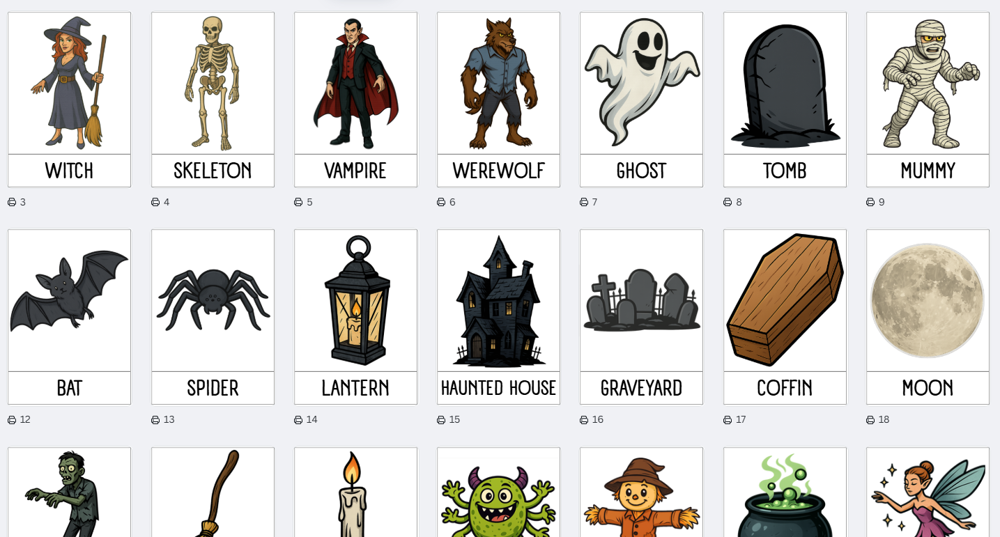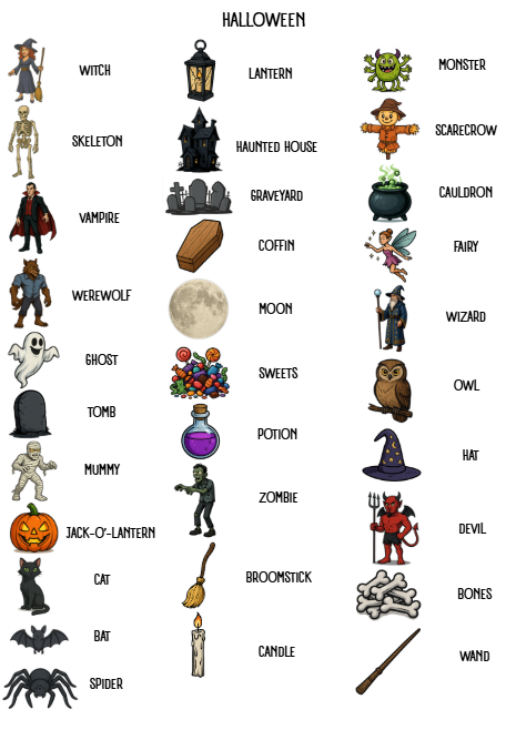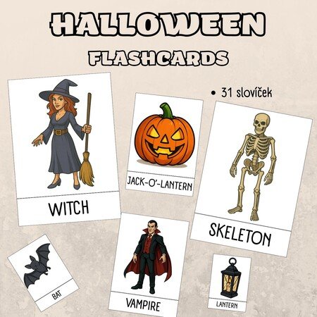 31 flashcards na téma Halloween (witch, skeleton, vampire, werewolf, ghost, tomb, mummy, jack-o’-lantern, cat, bat, spider, lantern, haunted house, graveyard, coffin, moon, sweets, potion, zombie, broomstick, candle, monster, scarecrow, cauldron, fairy, wizard, owl, hat, devil, bones, wand)