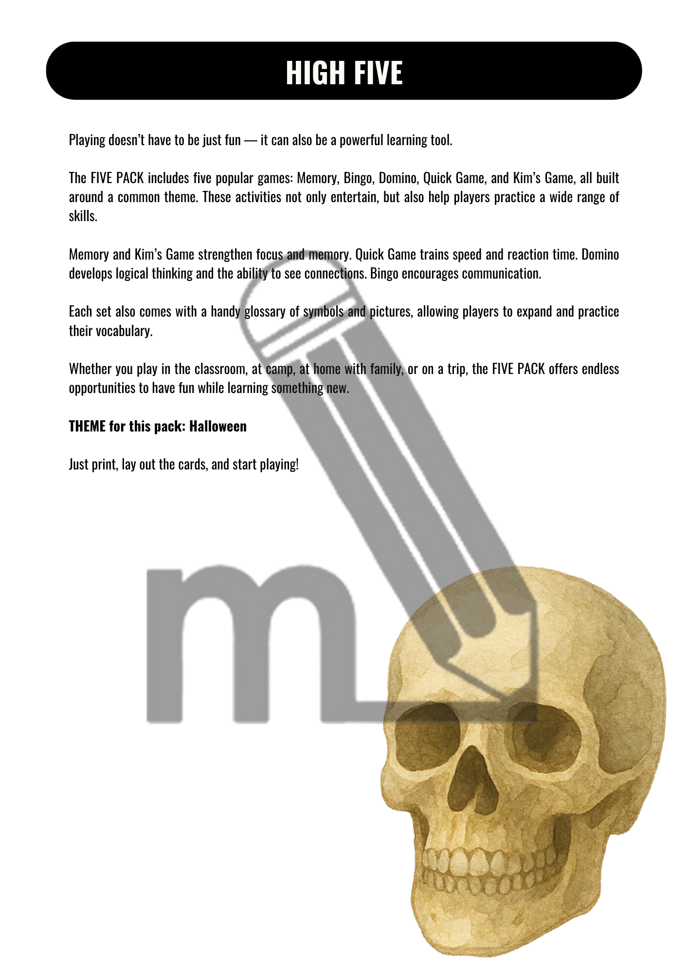 Hraním pěti oblíbených her – Memory, Bingo, Domino, Quick Match a Kim’s Game – vtáhnete žáky přímo do děje a anglická slovíčka k danému tématu si osvojí zcela přirozeně. Učení se stává hrou, při které si děti procvičí paměť, postřeh, logické myšlení i komunikaci.