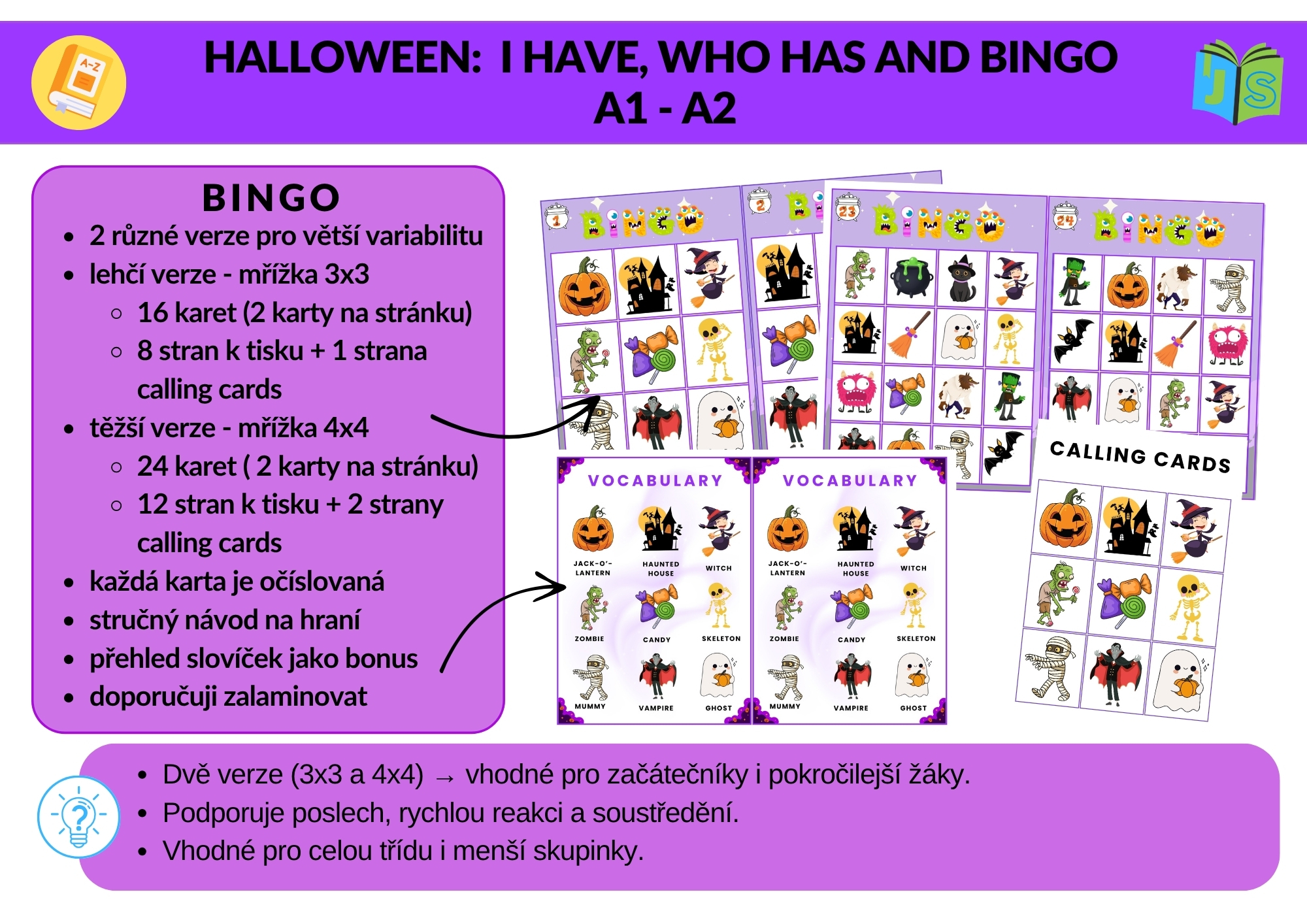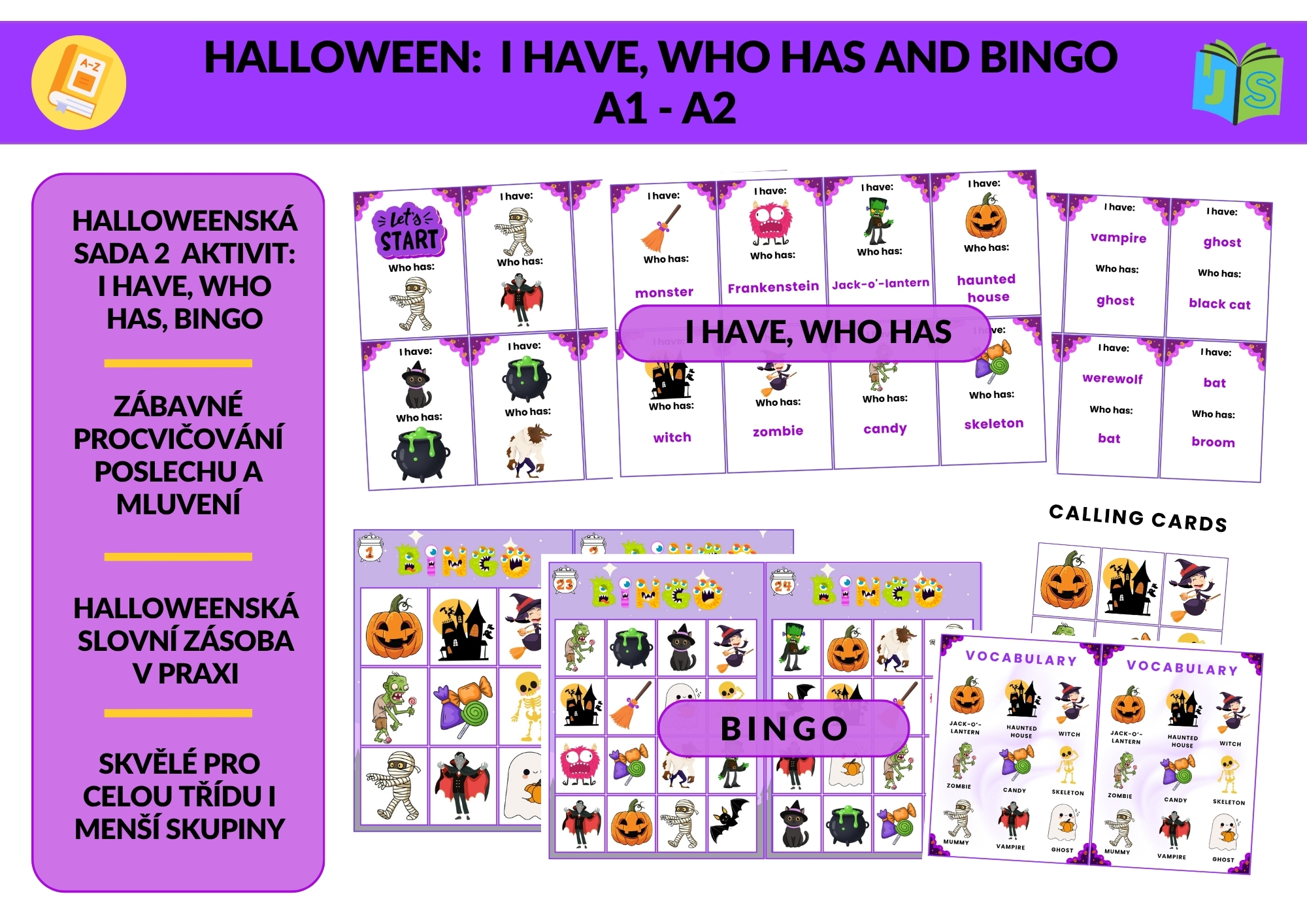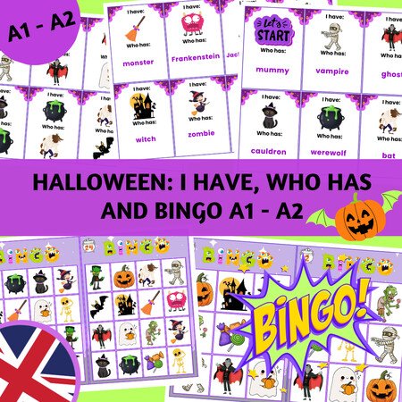 Tento halloweenský balíček přináší dvě oblíbené hry – I Have, Who Has a Bingo – v několika úrovních obtížnosti. Perfektní pro opakování slovní zásoby zábavnou formou, která baví celou třídu!