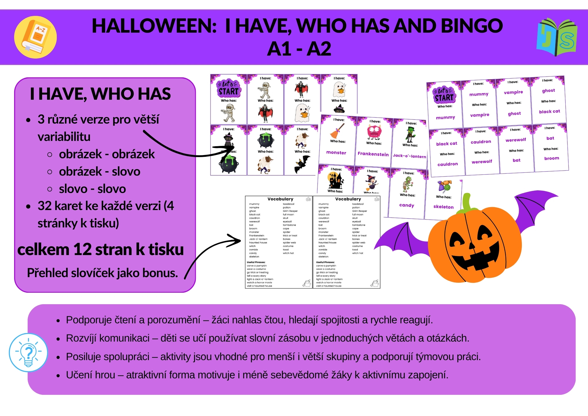 - Součástí je přehled všech slovíček a sada losovacích kartiček