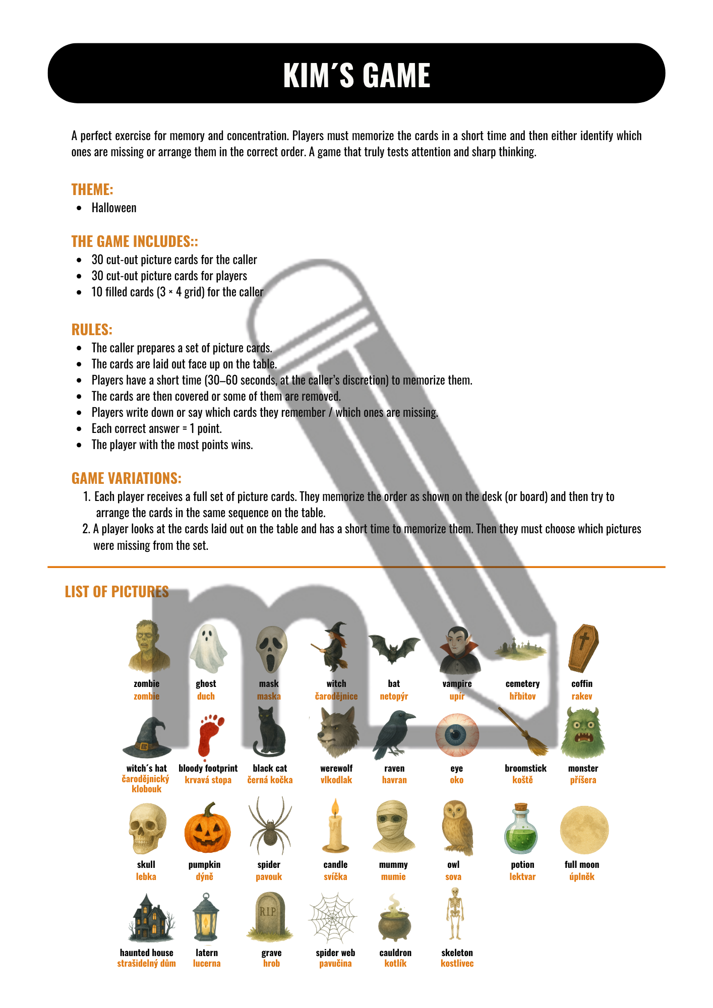 - 10 zaplněných karet (3 × 4 políček) pro moderátora