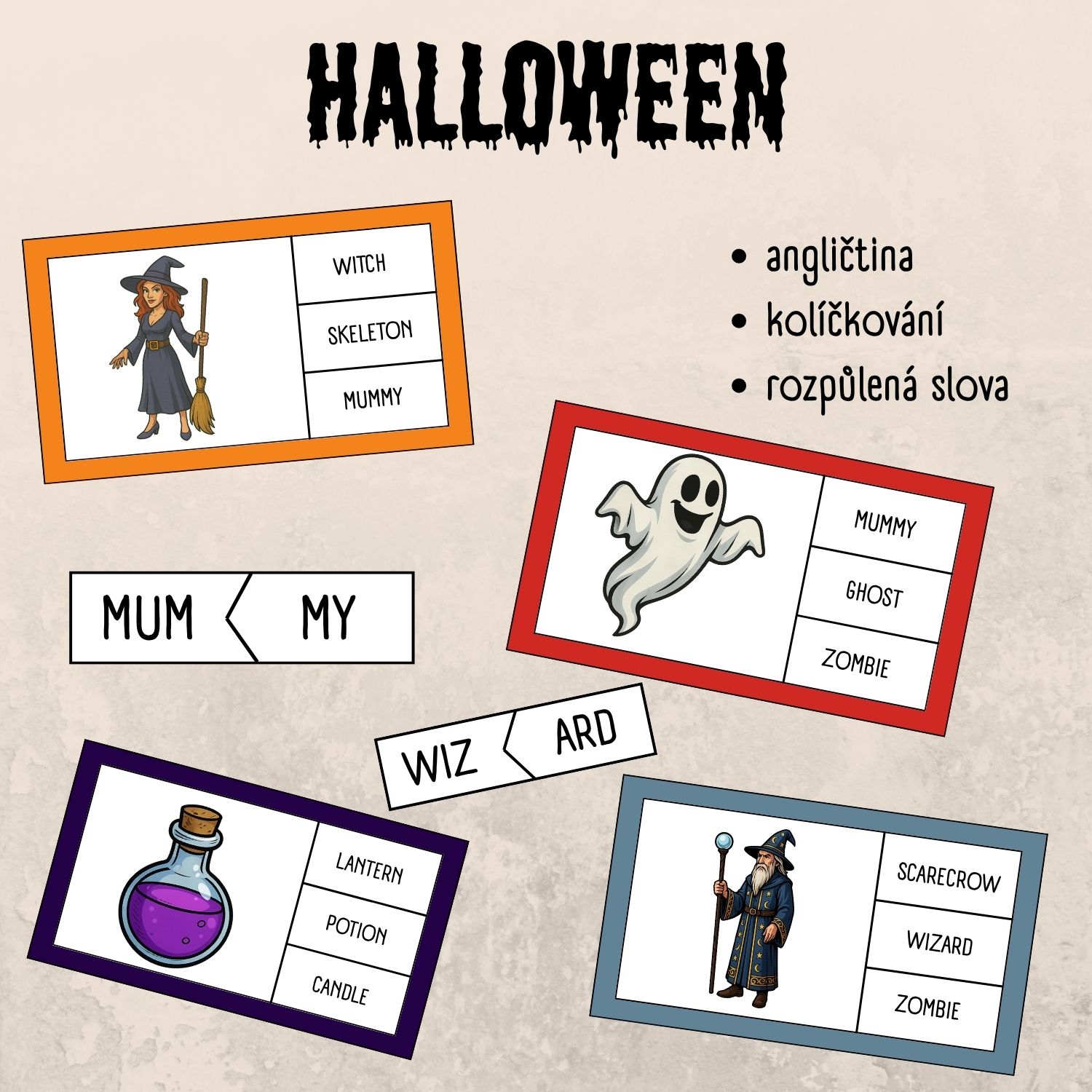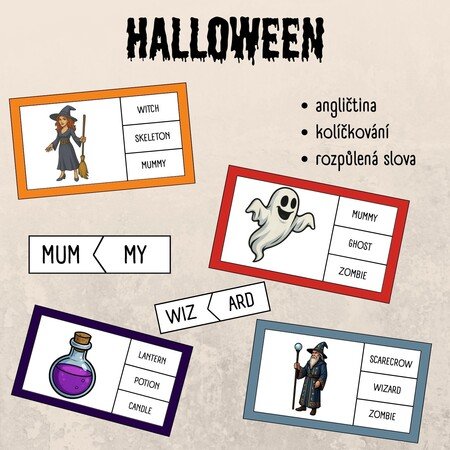 Zábavné aktivity na procvičení anglických slovíček na téma Halloween. Vhodné jako samostatná práce.