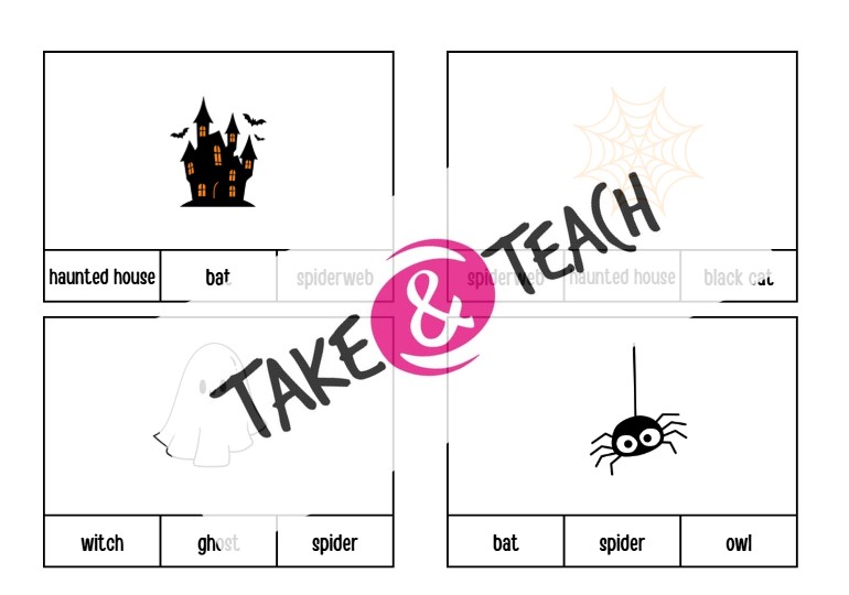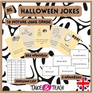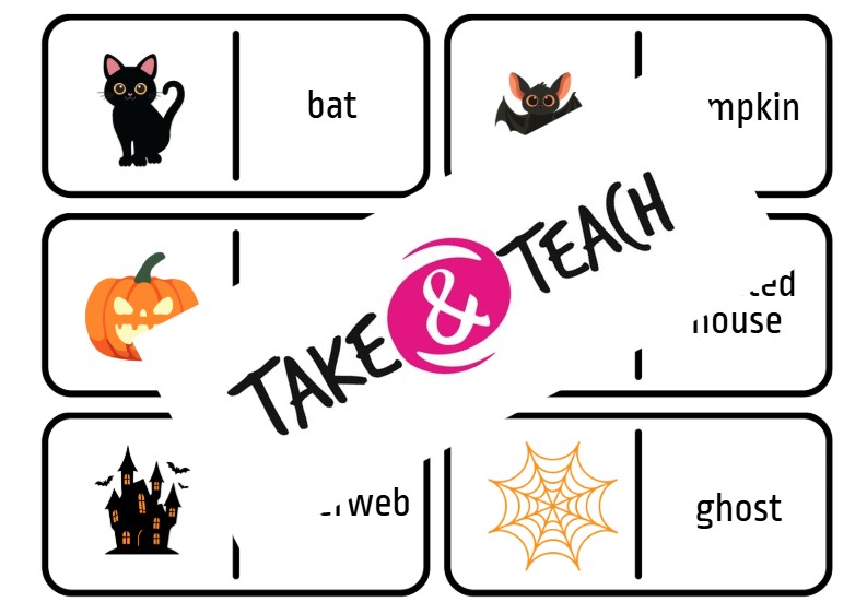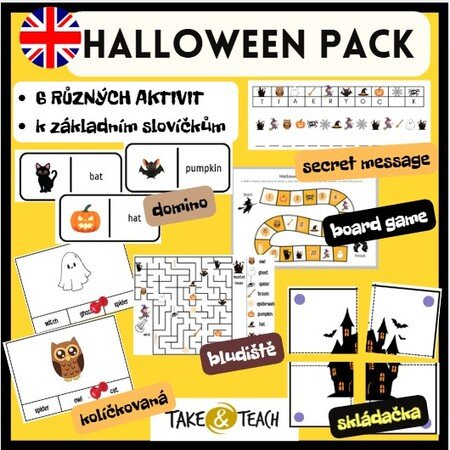 Materiál obsahuje tuto slovní zásobu: hat, cat, bat, spiderweb, spider, owl, witch, haunted house, candle, ghost, pumpkin, broom a 6 různých aktivit pro seznámení se slovní zásobou, procvičení slovíček, hry a sebekontrolu.