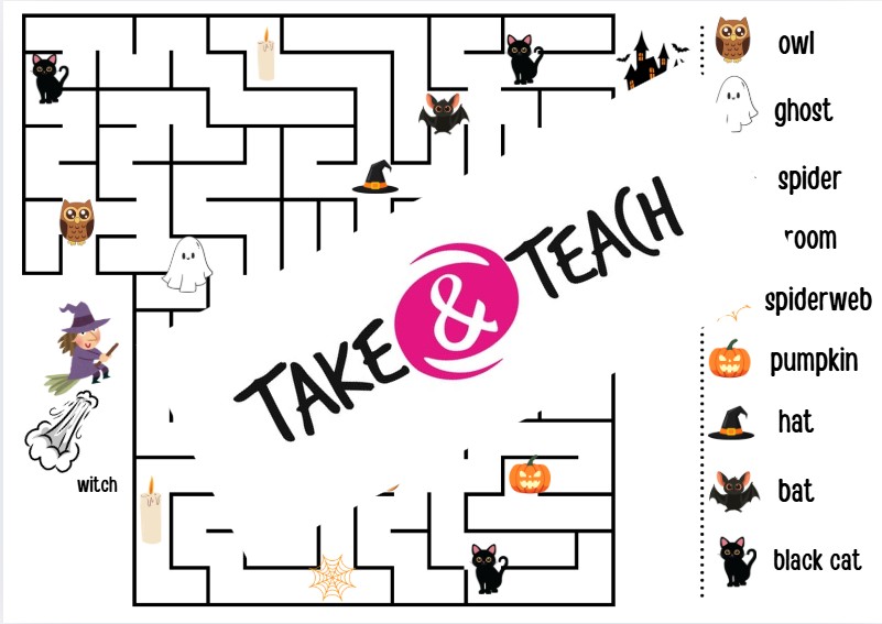 - HALLOWEEN MAZE - žáci pomáhají ČARODEJNICI v bludišti posbírat HALLOWEENSKÉ obrázky a při cestě je pojmenují podle nápovědy (pořadí obrázků v nápovědě jim ukazuje i směr cesty)