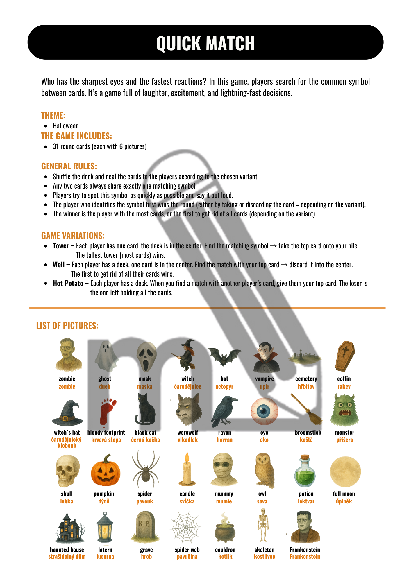 Rychlost, postřeh a spousta legrace! Hráči hledají shodné symboly a při tom si neustále opakují anglická slovíčka k danému tématu. Hra plná smíchu, která procvičí slovní zásobu i bystré oko.