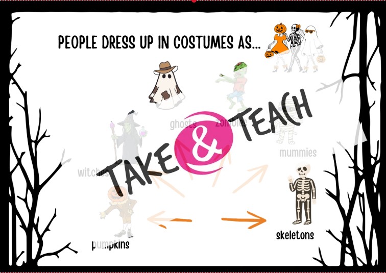 A. PDF prezentaci s obrázky a návodnými slovy (4 slidy) na základní slovní zásobu, zvyky, tradice a hry spojené s Halloweenem, vhodné k řízené konverzaci