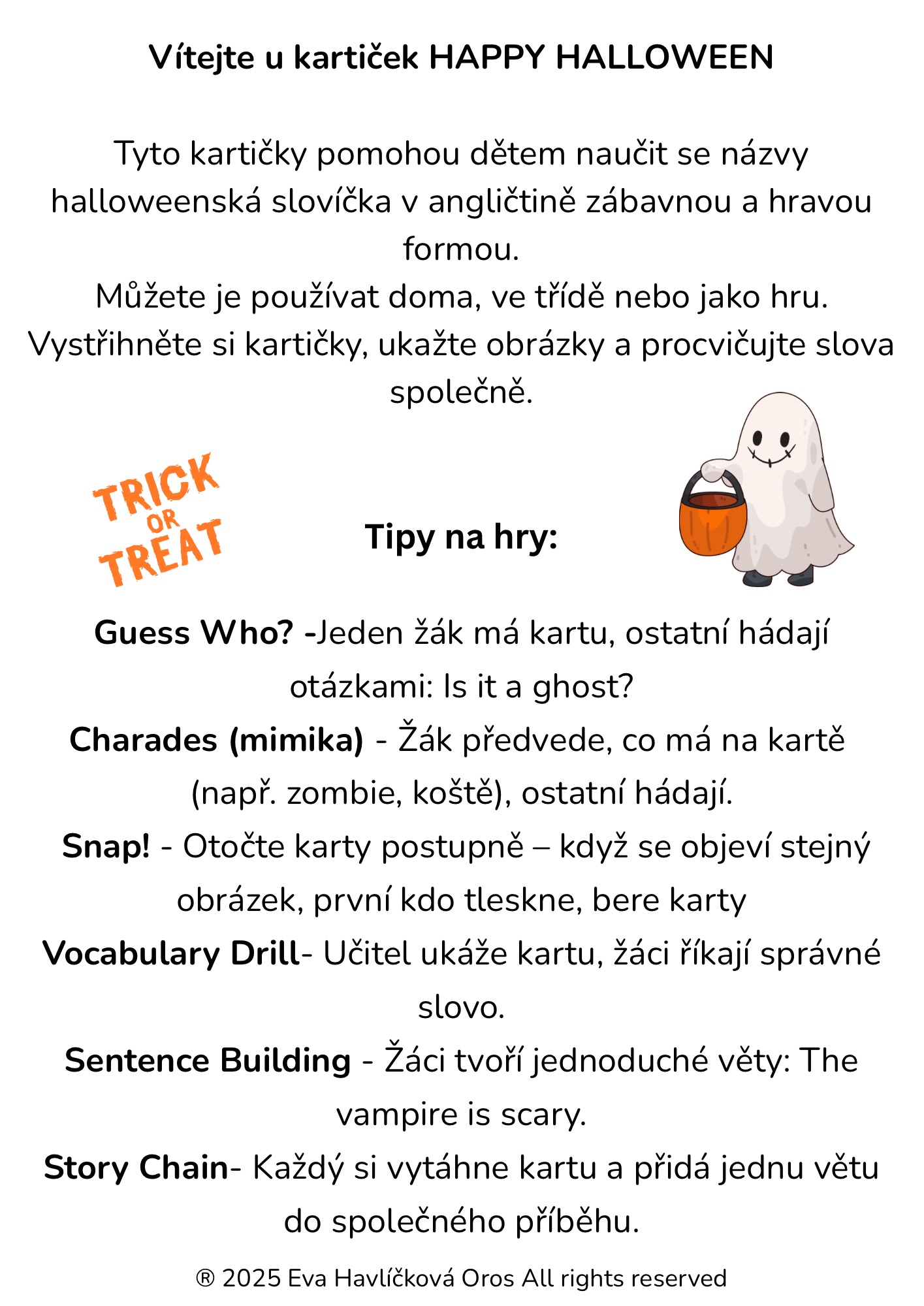 Děti si díky nim zábavnou a hravou formou osvojí halloweenskou slovní zásobu v angličtině i češtině.