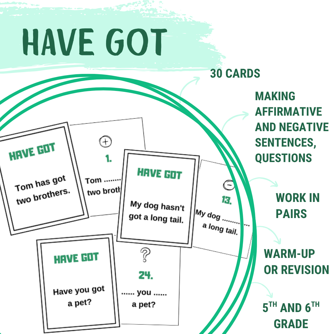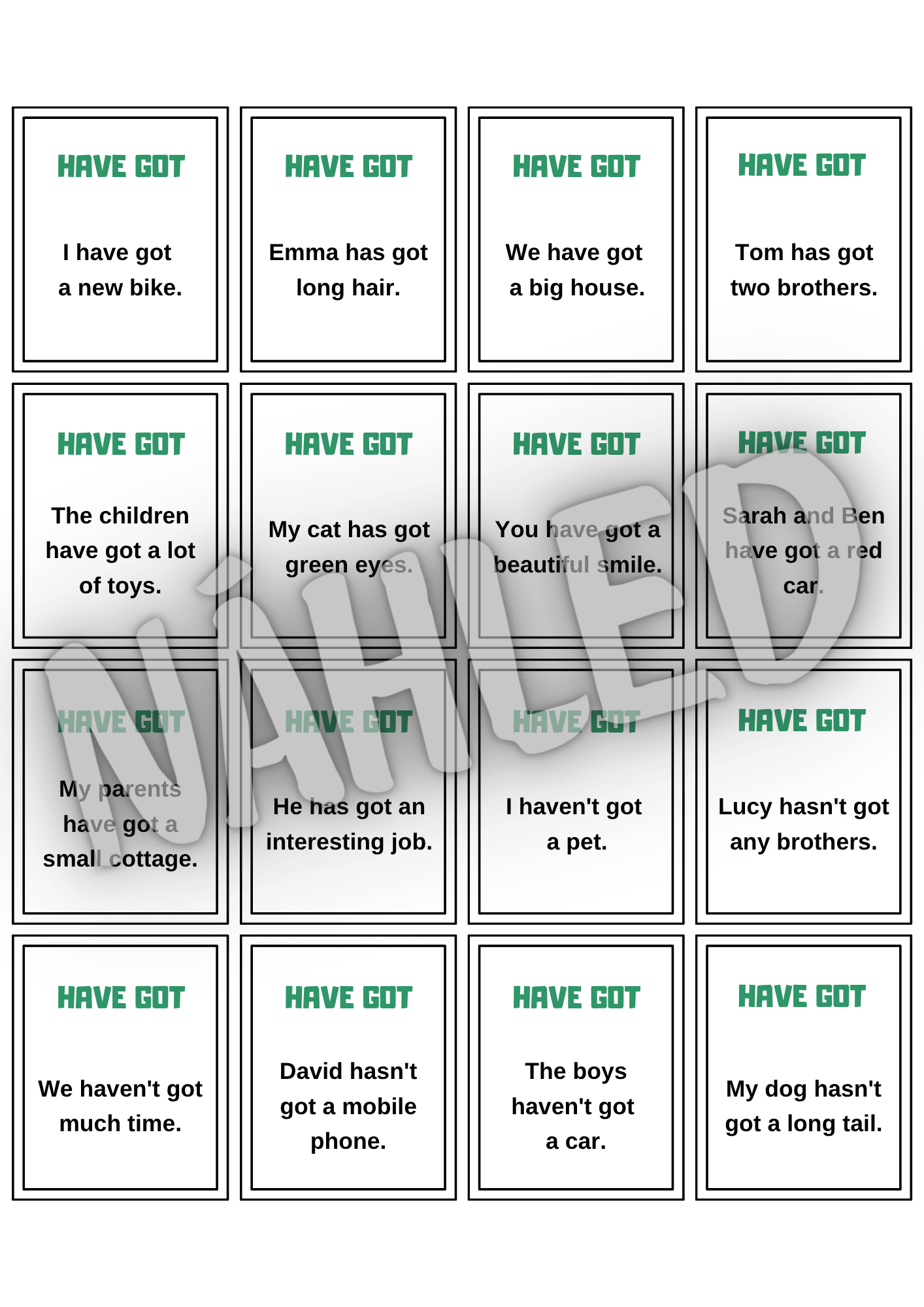 Set 30 kartiček, které jsou určené k procvičování slovesa have got (kladných vět, záporných vět a otázek). Na jedné straně kartičky je zadání, na druhé řešení.
