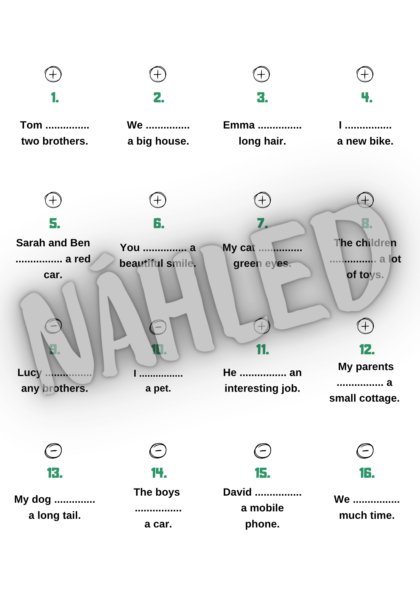- na jedné straně kartičky je věta, do které mají žáci doplnit správný tvar slovesa have got, a hlavně označení, jestli to má být kladná věta (+), záporná věta (-) nebo otázka (?)