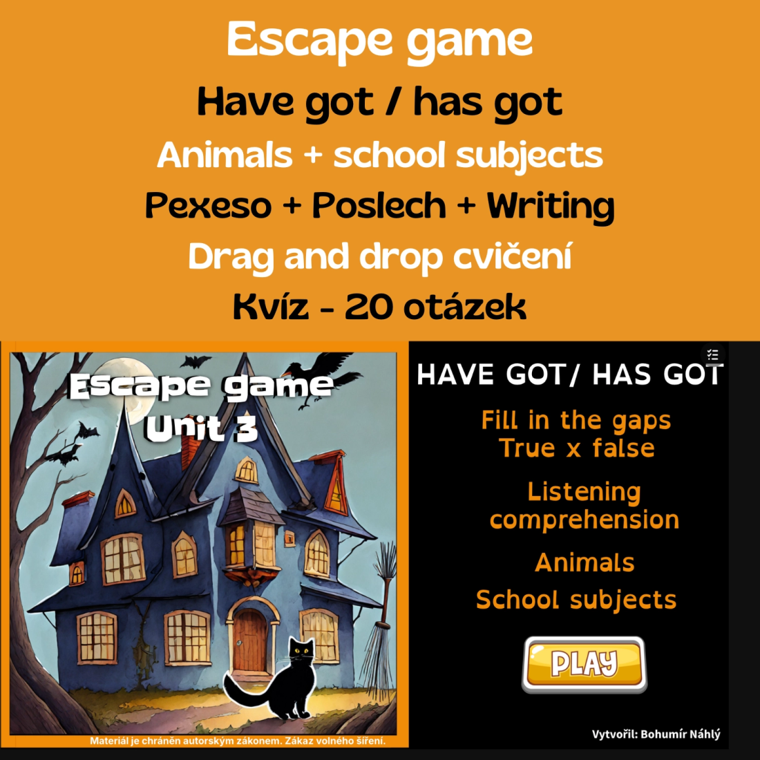 Cílem je postupně splnit 4 hlavní části skládající se z dílčích úkolů. Obsahově jde o opakování Unit 3 z učebnice Project 1, ale hra se dá použít v jakémkoliv ročníku, kde potřebujete procvičit danou gramatiku. Designově je zasazena do chatrče čarodějnice, ze které se musí hráč dostat. Doporučuji, abyste si hru sami nejdříve vyzkoušeli, než ji budete hrát s žáky.