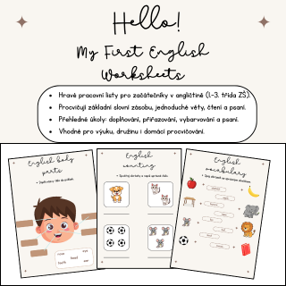 Hello! – My First English Worksheets je soubor pracovních listů určený pro malé školáky, kteří se s anglickým jazykem teprve seznamují. Materiál je navržen tak, aby byl pro děti pochopitelný, přehledný a hravý, a zároveň dobře využitelný při běžné výuce.