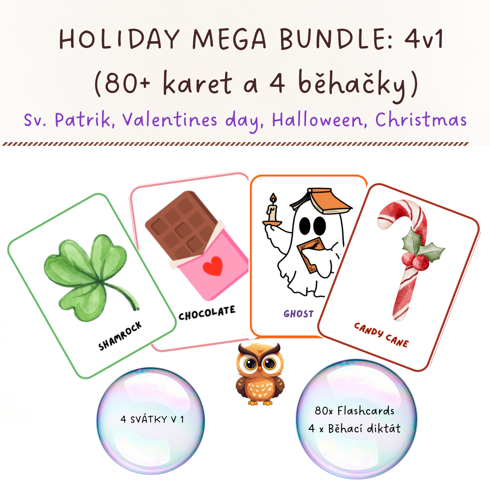 Mějte přípravy na nejoblíbenější svátky v roce vyřešené jednou provždy! Tento cenově zvýhodněný MEGA balíček je navržen pro učitele angličtiny na 1. stupni ZŠ, kteří chtějí do svých hodin vnést pohyb, hravost a moderní design, aniž by trávili večery výrobou vlastních materiálů.