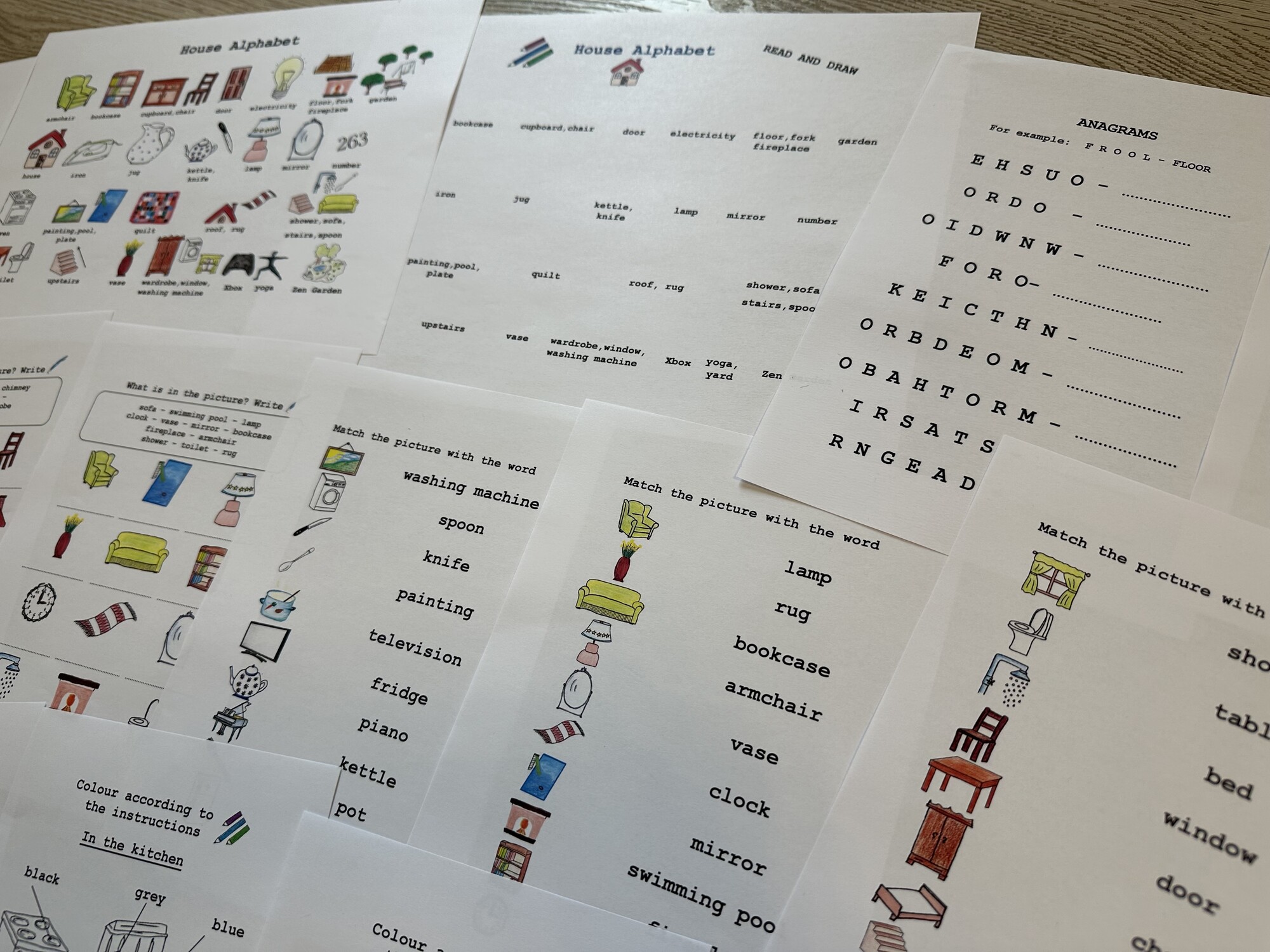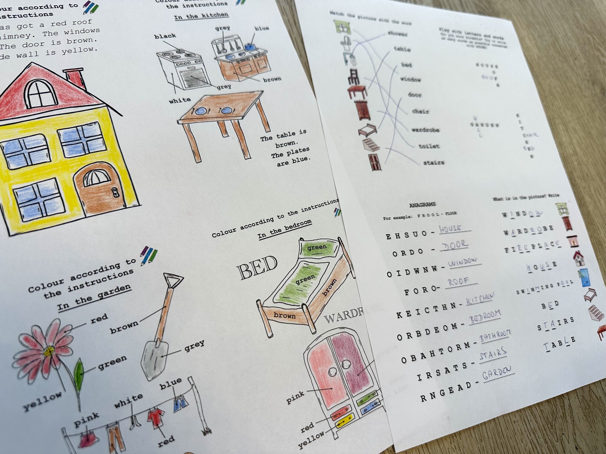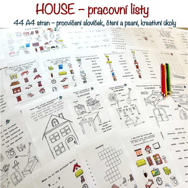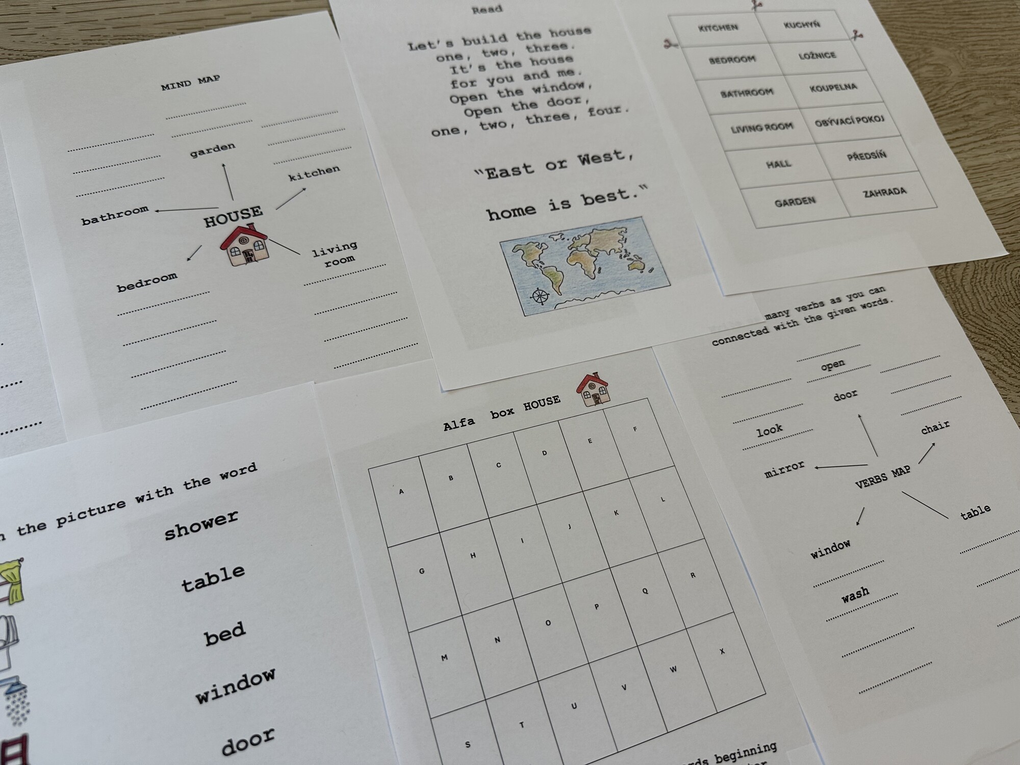 Procvičení slovní zásoby, psaní, čtení. Kreativní úkoly – křížovka, osmisměrka, vybarvování, psaní, kreslení, přesmyčky, rhymes – rýmy, hádanky, básničky, plakáty se slovíčky, myšlenkové mapy.