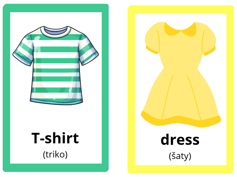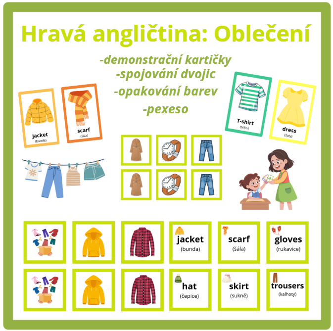 Soubor obsahuje: 20 listů, které rozvíjejí anglickou slovní zásobu vztahující se k tématu: oblečení. Listy je vhodné zalaminovat a vystřihnout. Následně můžeme využít pro práci s dětmi na koberci, v lavicích, ale i jako výzdobu na nástěnku, případně inspirace pro Vás: já využívám anglický koutek, kde mám magnetickou tabuli a dětem vždy kartičky pověsím a ony se mohou kdykoliv o přestávce k našemu anglickému koutku posadit a samy se vzdělávat.