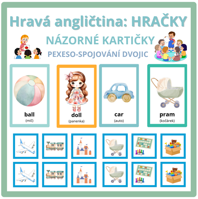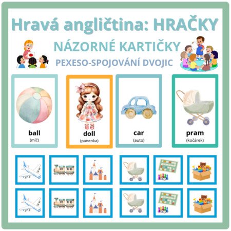 Co budete potřebovat na přípravu? • Tiskárnu s barevným tiskem, laminovačku, fólie Soubor obsahuje: 20 listů, které rozvíjejí anglickou slovní zásobu vztahující se k tématu: hračky. Listy je vhodné zalaminovat a vystřihnout. Následně můžeme využít pro práci s dětmi na koberci, v lavicích, ale i jako výzdobu na nástěnku, případně inspirace pro Vás: já využívám anglický koutek, kde mám magnetickou tabuli a dětem vždy kartičky pověsím a ony se mohou kdykoliv o přestávce k našemu anglickému koutku posadit a samy se vzdělávat. Celkem soubor obsahuje dvoje využití. 1. Názorné kartičky: podporující rozvoj slovní zásoby 2. Hru pexeso: kdy si děti hravou formou mohou osvojovat nová slovíčka prostřednictvím této známé hry. A to ve dvojí možnosti, buď pouze pomocí obrázků, nebo hledání obrázku a dvojice, kde je slovo napsané anglicky. Co se dítě naučí? • pracovat s názornými kartičkami, obohatit slovní zásobu k tématu hračky, pozornost.