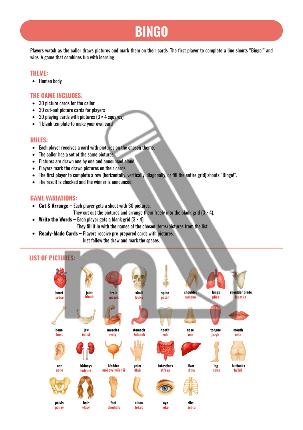 Bingo je hra plná napětí a radosti. Děti sledují losované obrázky, označují je na své kartě a přitom si přirozeně opakují a upevňují anglická slovíčka k danému tématu.