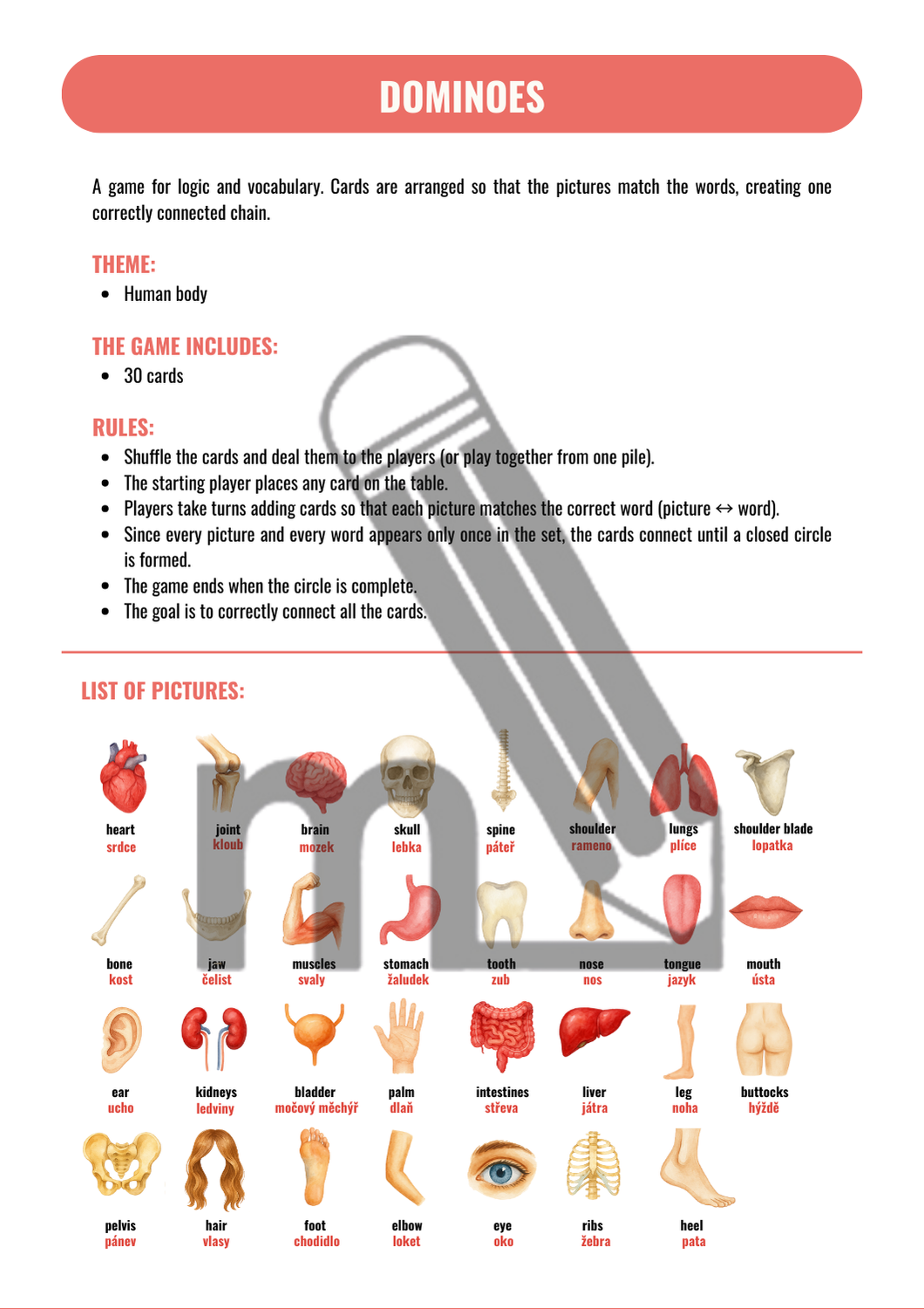 Domino baví malé i velké. Při skládání obrázků a slovíček do správné řady si děti hravě rozvíjejí logické myšlení a zároveň se učí spojovat anglická slovíčka s obrázky.
