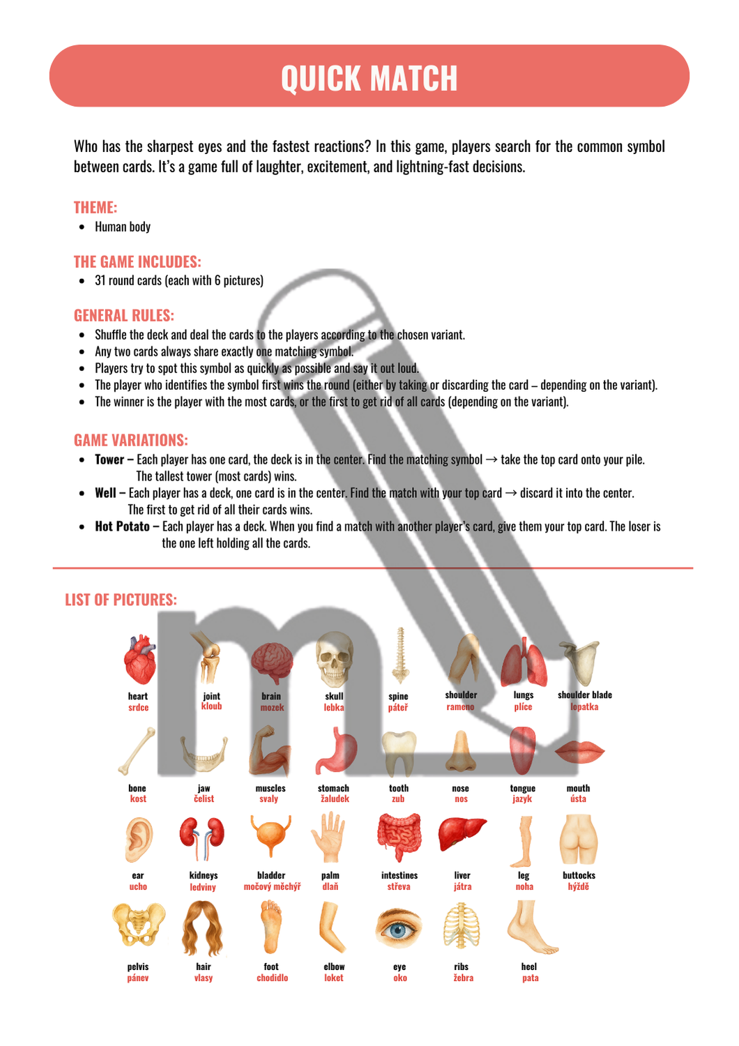 Rychlost, postřeh a spousta legrace! Hráči hledají shodné symboly a při tom si neustále opakují anglická slovíčka k danému tématu. Hra plná smíchu, která procvičí slovní zásobu i bystré oko.